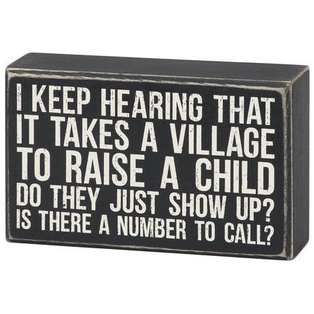 A classic black and white wooden box sign from our Box Sign Style Collection displaying a fun parent inspired sentiment that reads "I Keep Hearing That It Takes A Village To Raise A Child - Do They Just Show Up? Is There A Number To Call?" This fun parent box sign features distressed details with a coordinating black color on sides and back. Our Is There A Number To Call sign is easy to hang or can free-stand on a flat surface for display. A fun gift for parents that can be easily displayed to add personality to any home or work space.