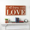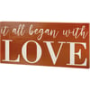 A wooden box sign featuring "It All Began With Love" sentiment, brown background, and natural wood sides for added interest. Our It All Began With Love box sign is easy to hang or can free-stand alone.