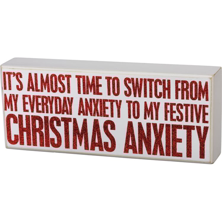 A white wooden box sign featuring an "It's Almost Time To Switch From My Everyday Anxiety To My Festive Christmas Anxiety" sentiment in red glitter details. Easy to hang or can free-stand alone.
