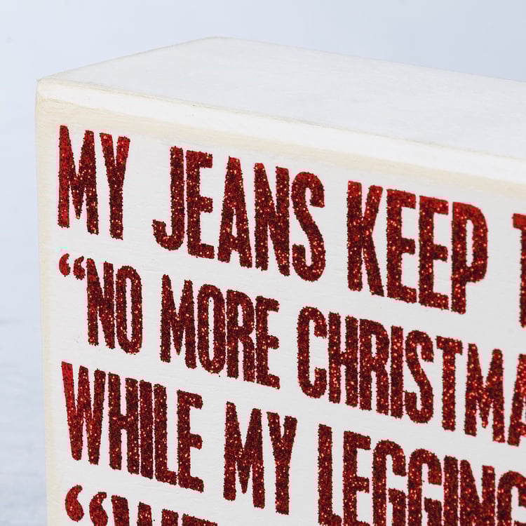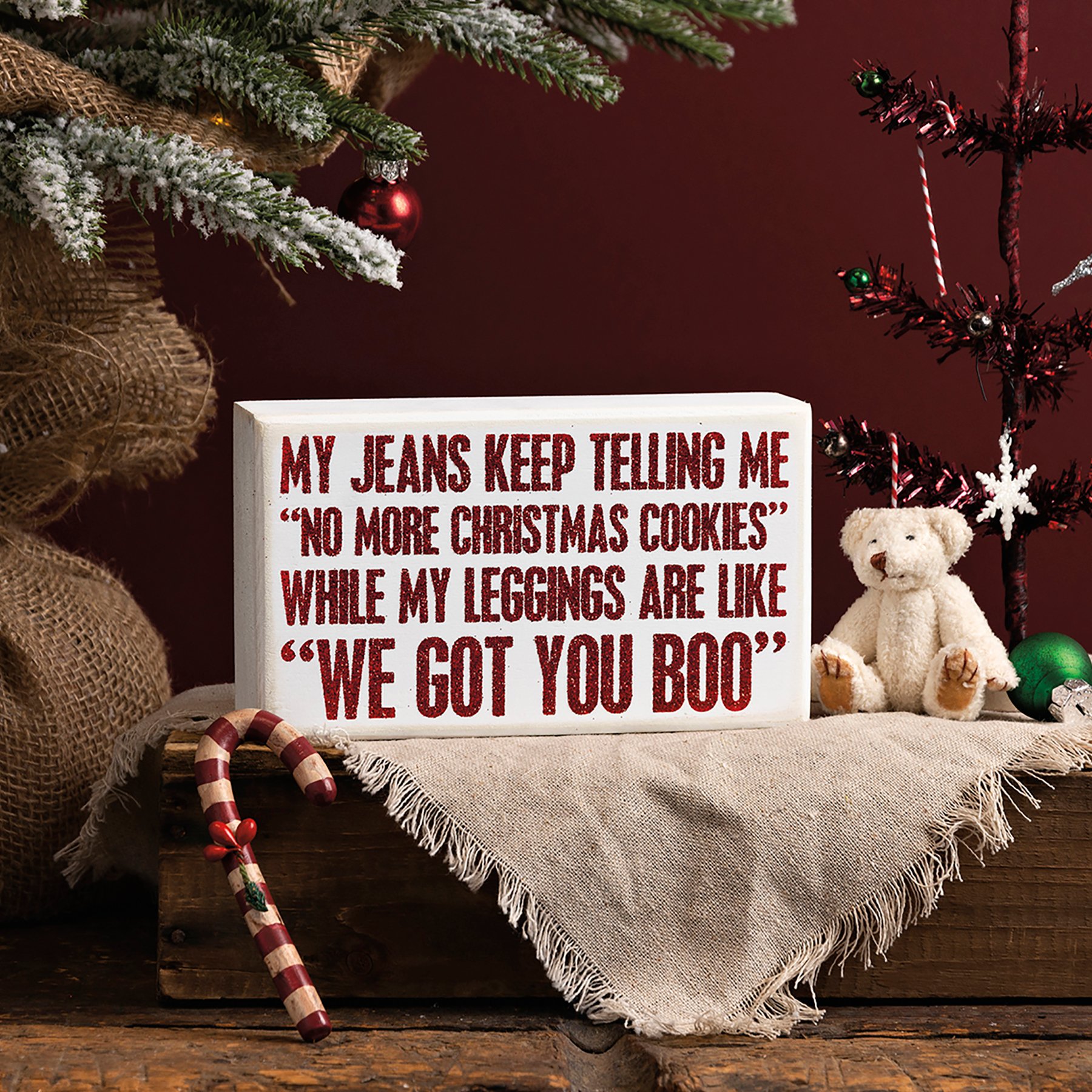 A white wooden box sign featuring a glittery red "My Jeans Keep Telling Me 'No More Christmas Cookies' While My Leggings Are Like 'We Got You Boo'" sentiment. Easy to hang or can free-stand alone.