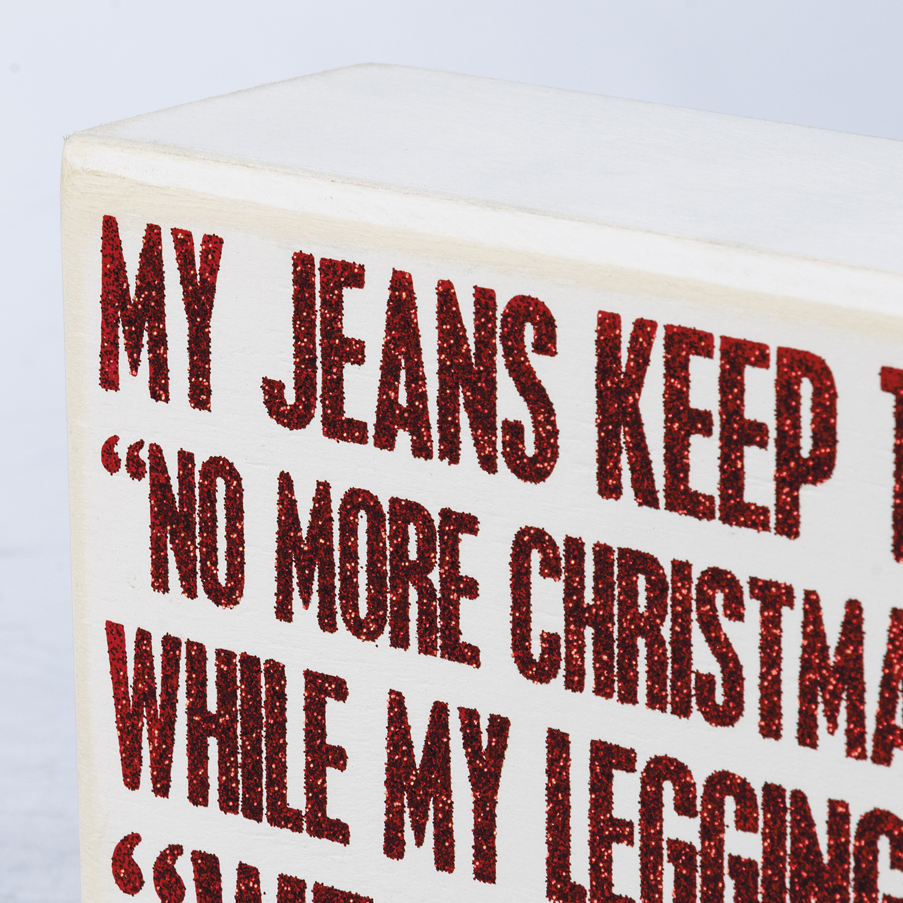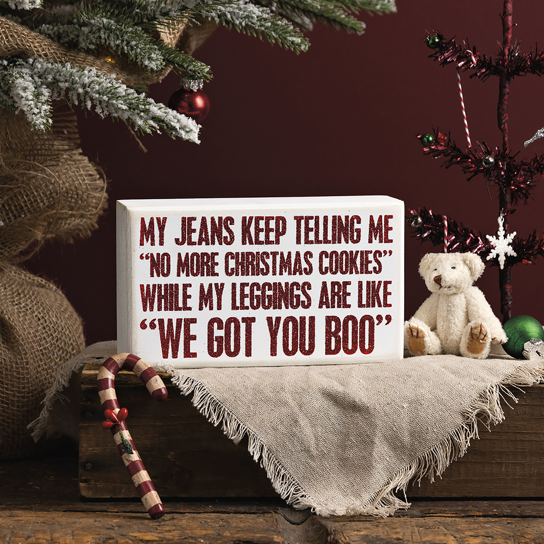 A white wooden box sign featuring a glittery red "My Jeans Keep Telling Me 'No More Christmas Cookies' While My Leggings Are Like 'We Got You Boo'" sentiment. Easy to hang or can free-stand alone.