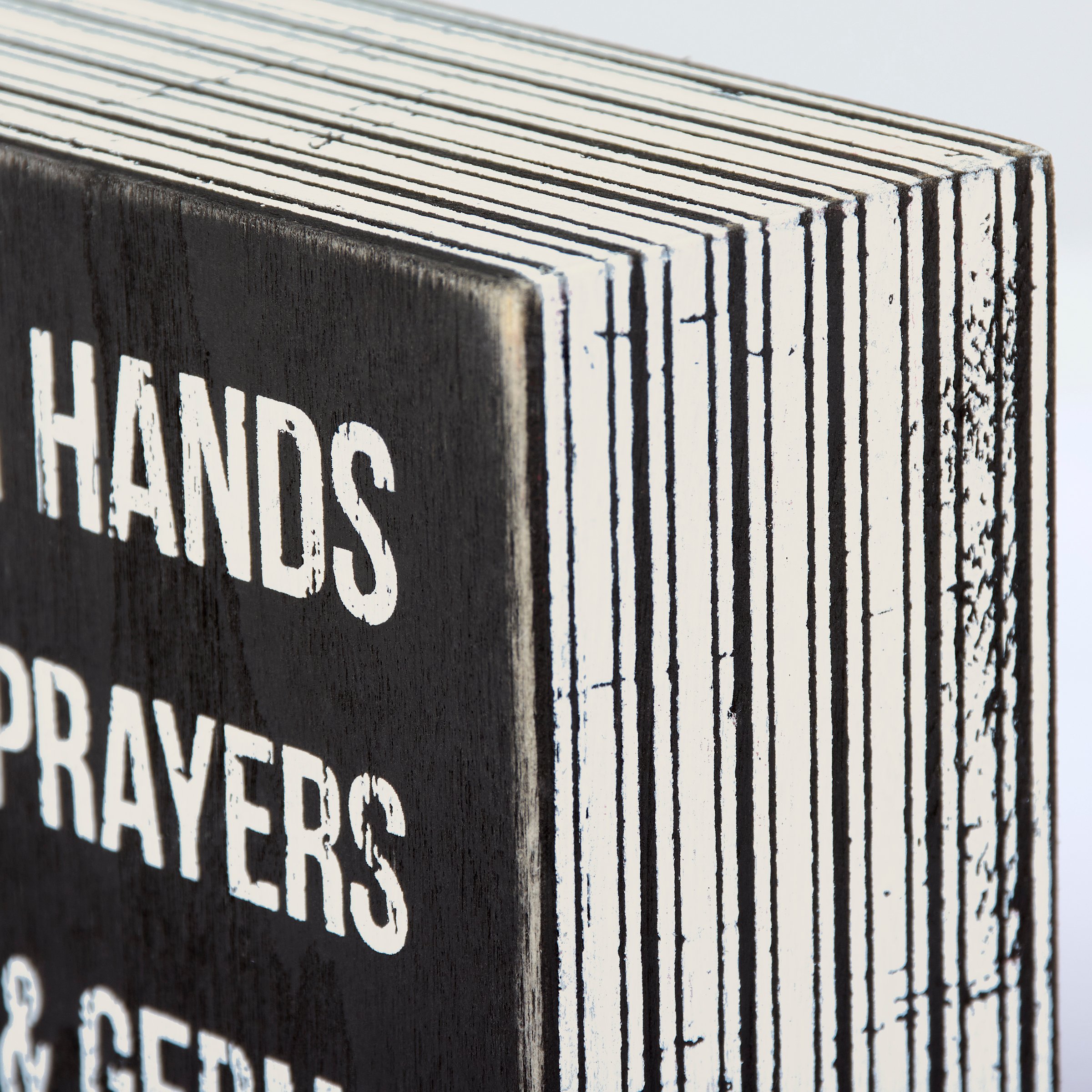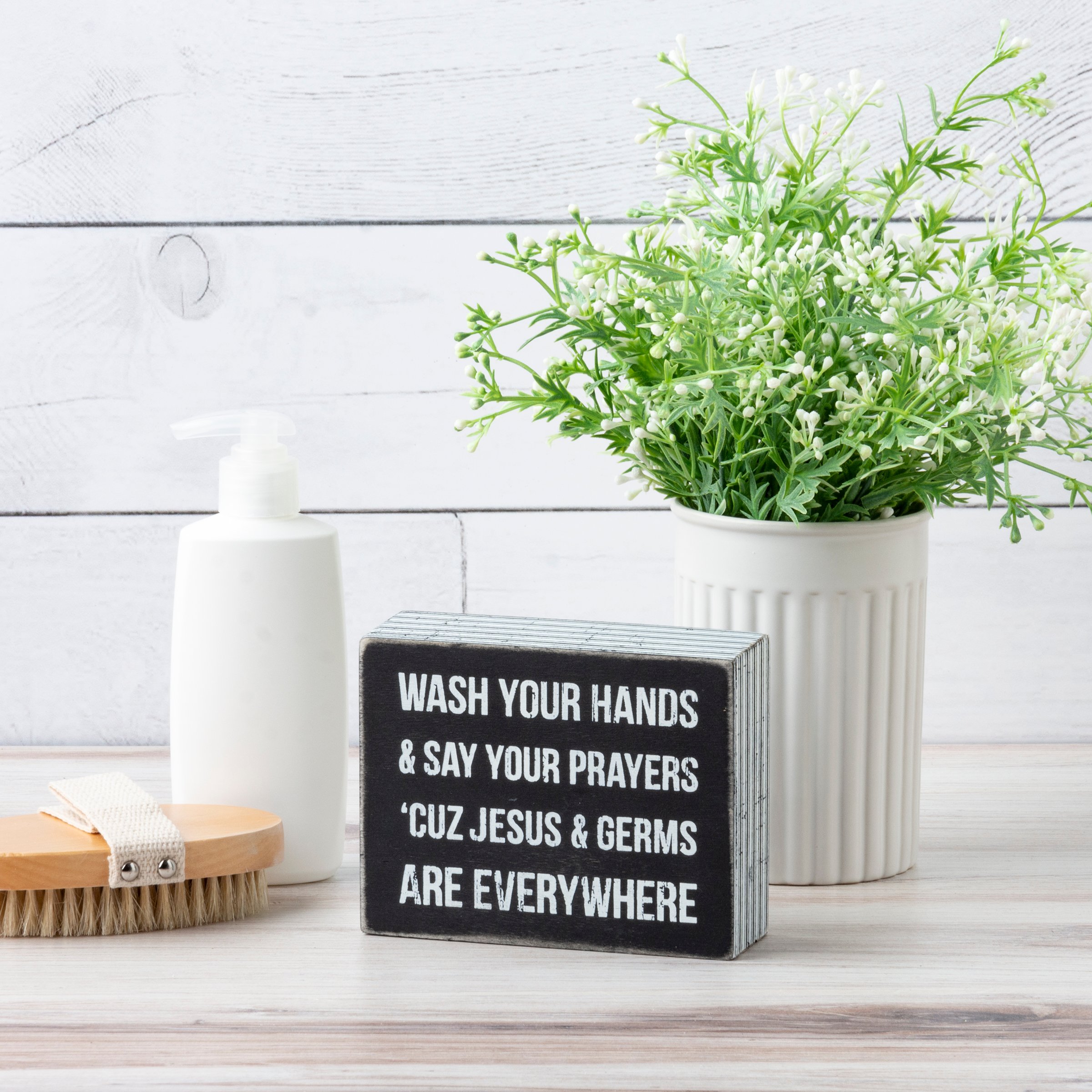 A classic black and white wooden box sign featuring a distressed "Wash Your Hands & Say Your Prayers 'Cuz Jesus & Germs Are Everywhere" sentiment with striped trim designs. Easy to hang or can free-stand alone. Not eligible for discounting.