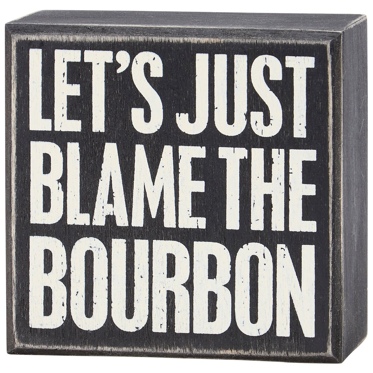 A classic black and white wooden box sign from our Box Sign Collection displaying a humorous alcohol inspired sentiment that reads "Let's Just Blame The Bourbon." Funny box sign features distressed details with coordinating black color on sides and back. Our Just Blame The Bourbon box sign is easy to hang or can free-stand alone. A funny alcohol-themed gift that can be easily displayed in any home or work space.