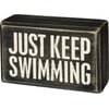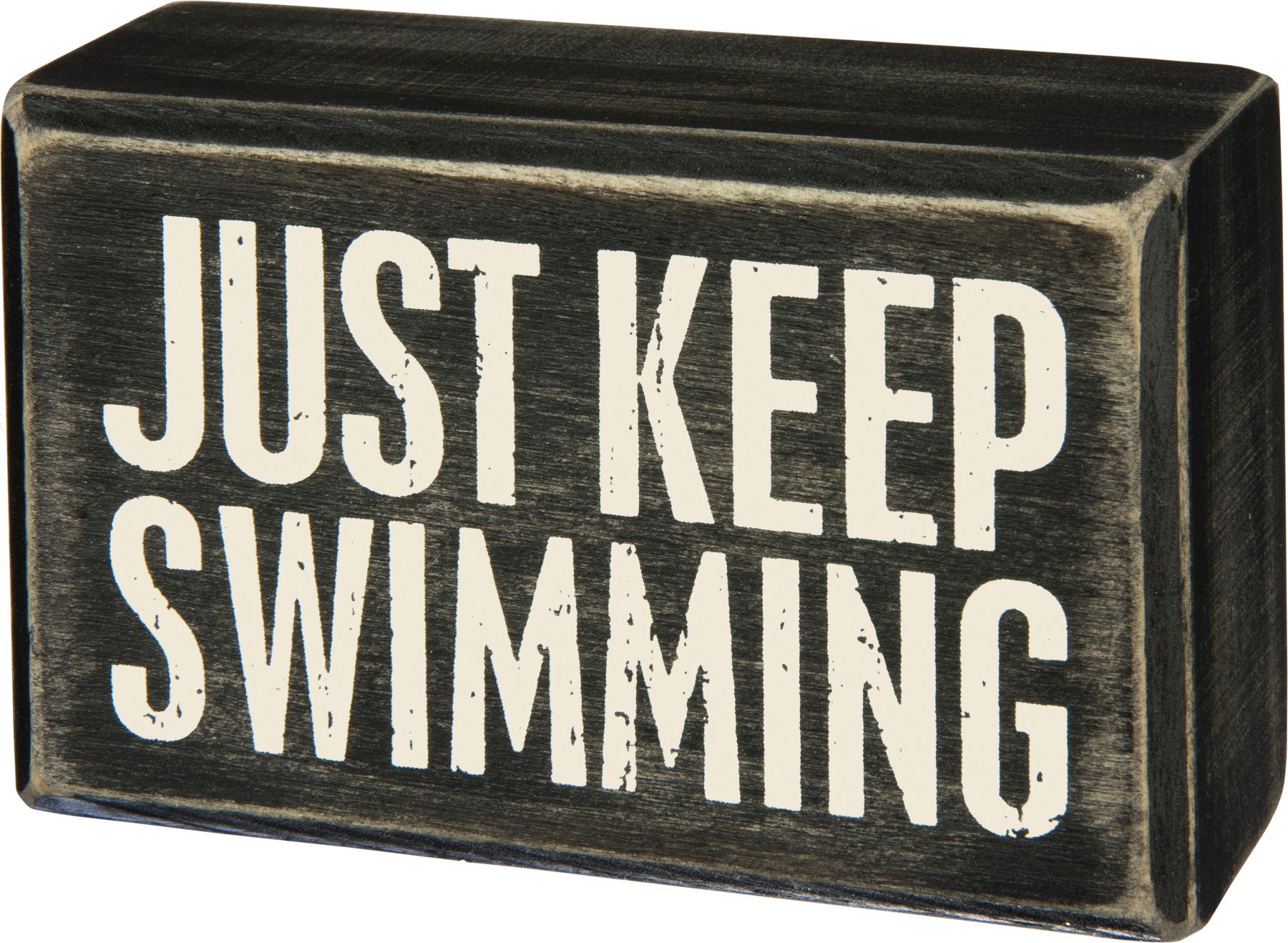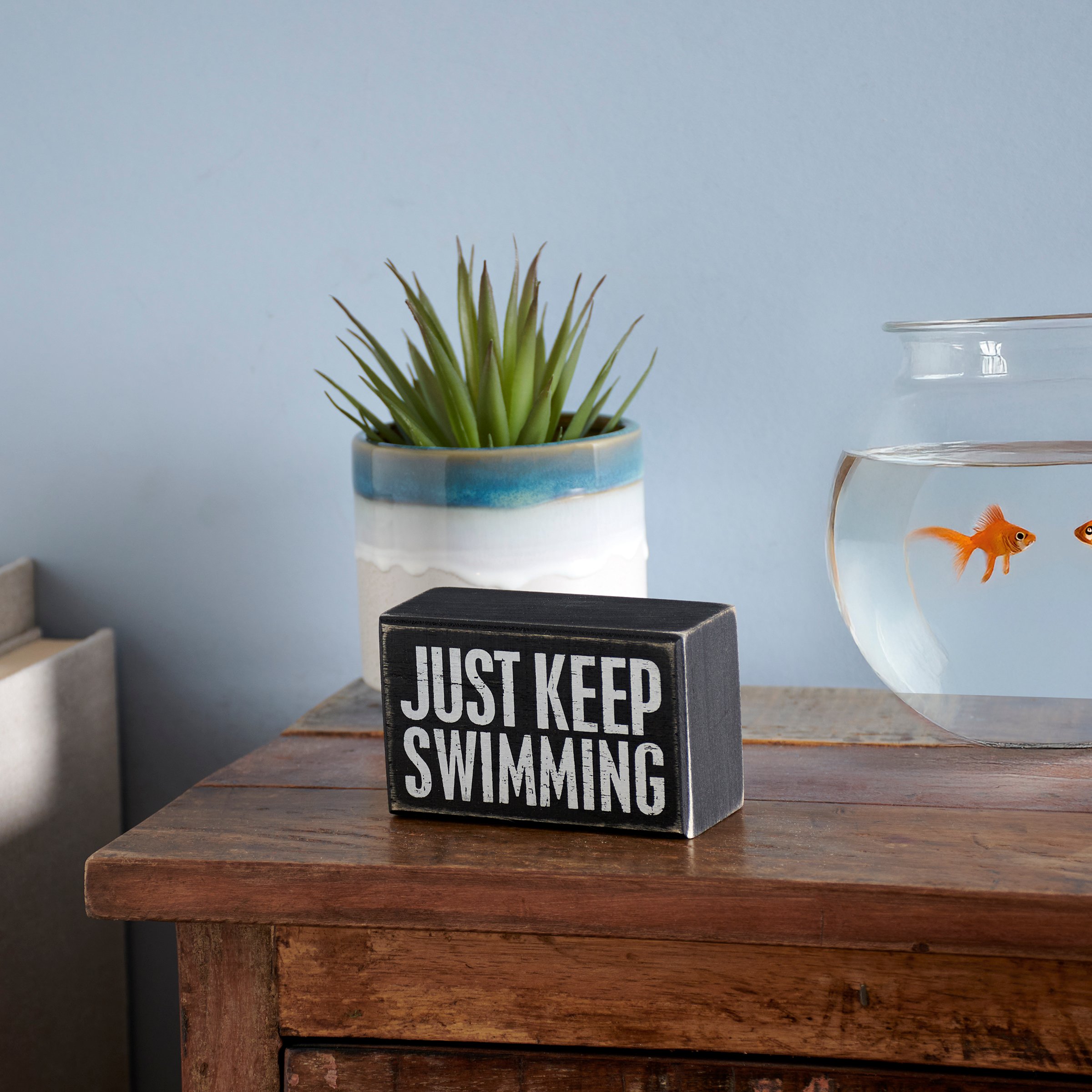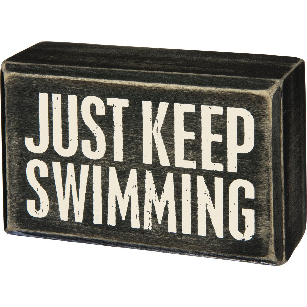 A classic black and white wooden box sign from our Box Sign Collection features a distressed "Just Keep Swimming" sentiment. The Just Keep Swimming sign is easy to hang or can free-stand alone.