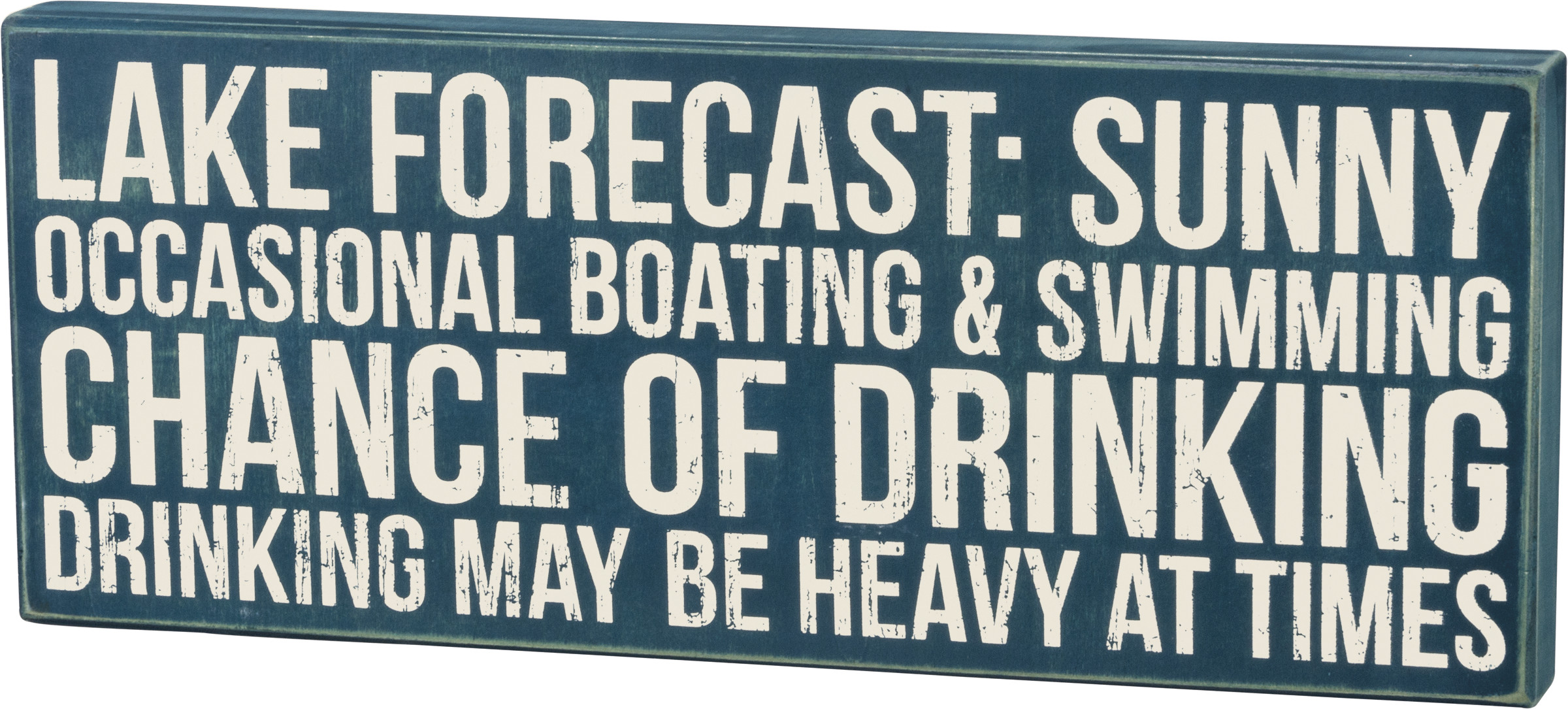 A wooden box sign featuring a distressed "Lake Forecast: Sunny - Occasional Boating & Swimming - Chance Of Drinking - Drinking May Be Heavy At Times" sentiment that complements well with existing decor. Easy to hang or can free-stand alone.