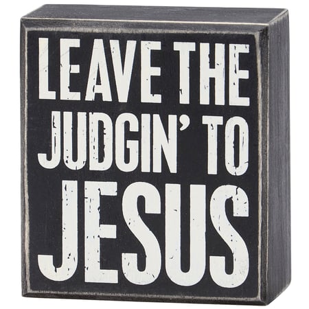 A classic black and white wooden box sign from our Box Sign Collection displaying a sassy faith inspired sentiment that reads "Leave The Judgin' To Jesus." Funny faith box sign features distressed details with coordinating black color on sides and back. Our Leave The Judgin' To Jesus box sign is easy to hang or can free-stand alone. A funny faith-themed gift that can be easily displayed in any home or work space.