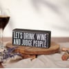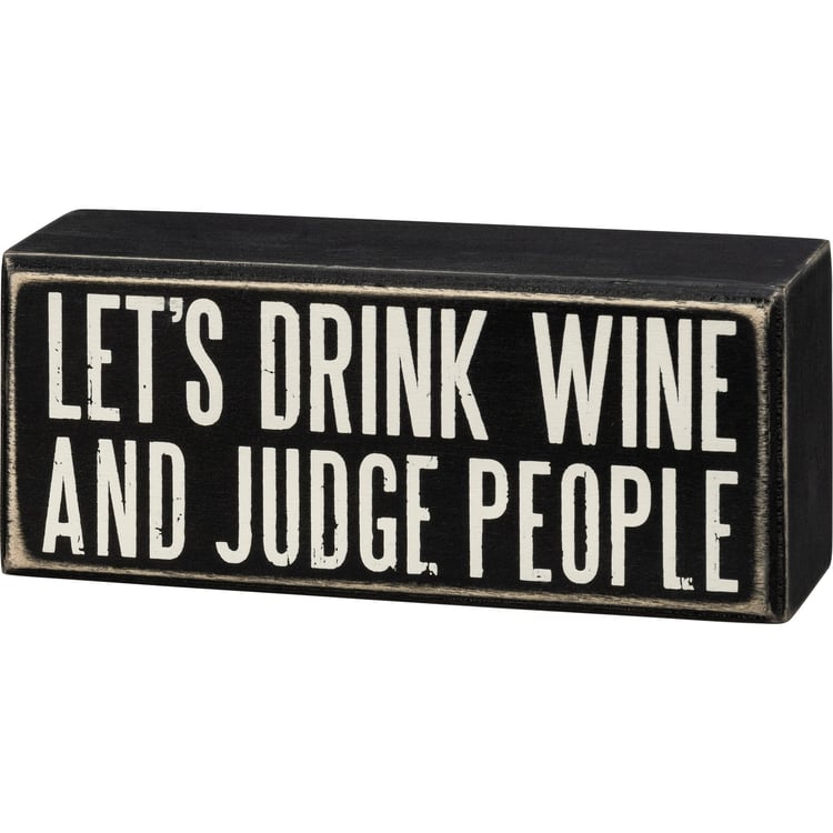 A classic black and white box sign featuring "Let's Drink Wine And Judge People" sentiment. Easy to hang or can free-stand alone.