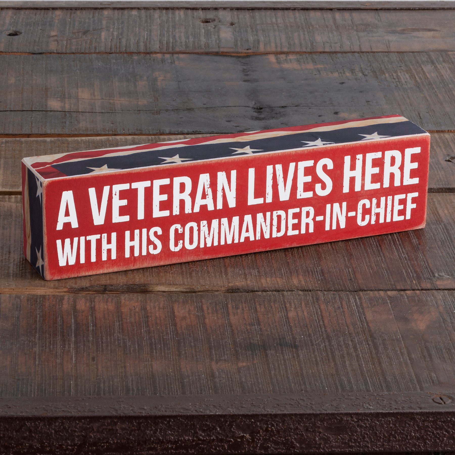 A wood home sign featuring a patriotic palette with a distressed "A Veteran Lives Here With His Commander-In-Chief" sentiment and stars and stripes trim designs. Easy to hang or can free-stand alone.