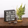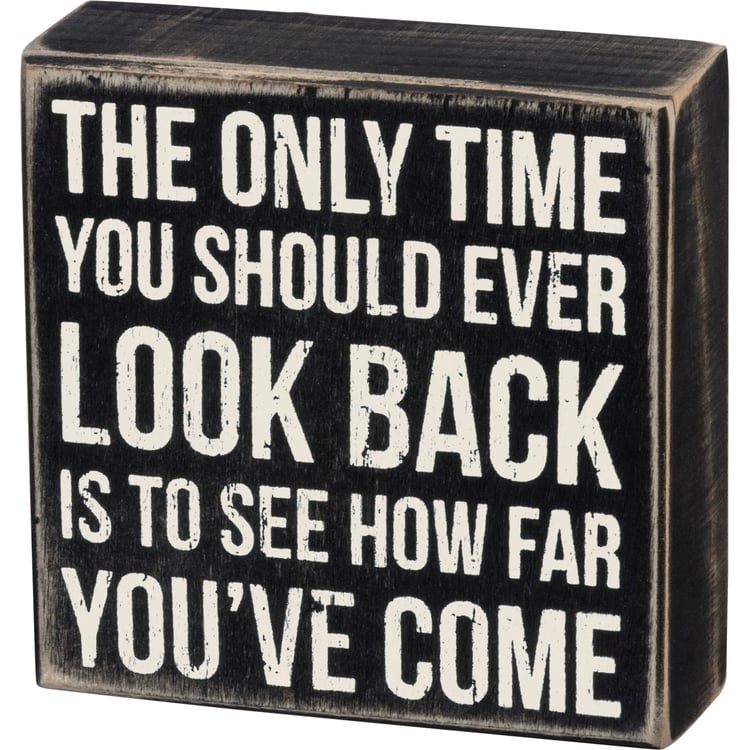 A classic black and white wooden box sign featuring a distressed "The Only Time You Should Ever Look Back Is To See How Far You've Come" sentiment. Easy to hang or can free-stand alone.