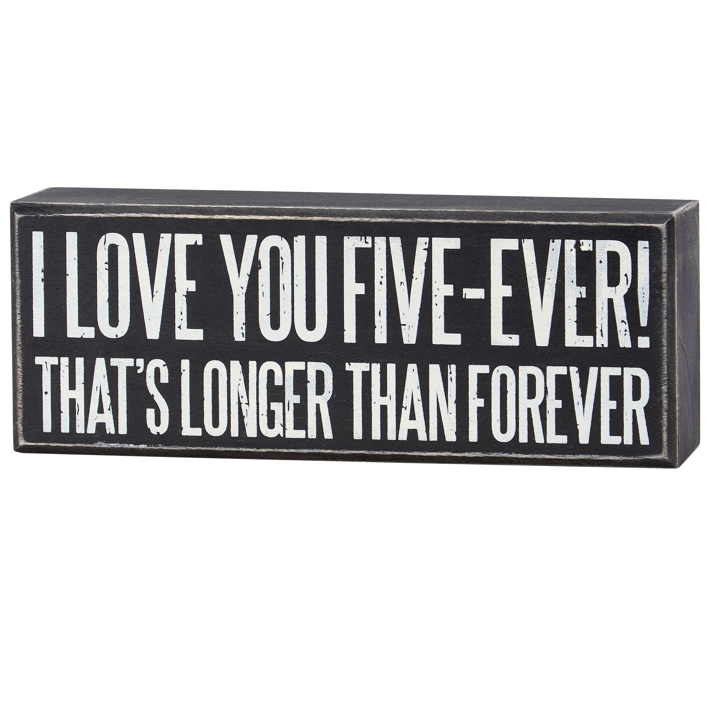 A classic black and white wooden box sign from our Box Sign Collection displaying a fun love-themed sentiment that reads "I Love You Five-ever! That's Longer Than Forever." Funny box sign features distressed details with coordinating black color on sides and back. Our Love You Five-ever box sign is easy to hang or can free-stand alone. A funny gift for friends and loved ones that can be easily displayed in any home or work space.