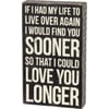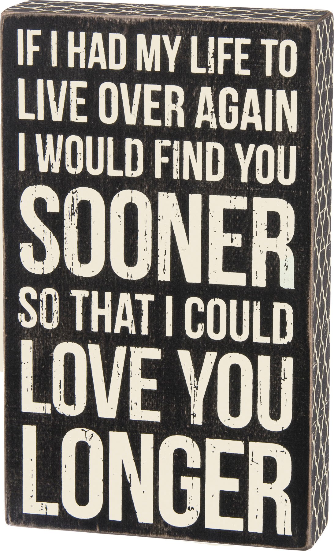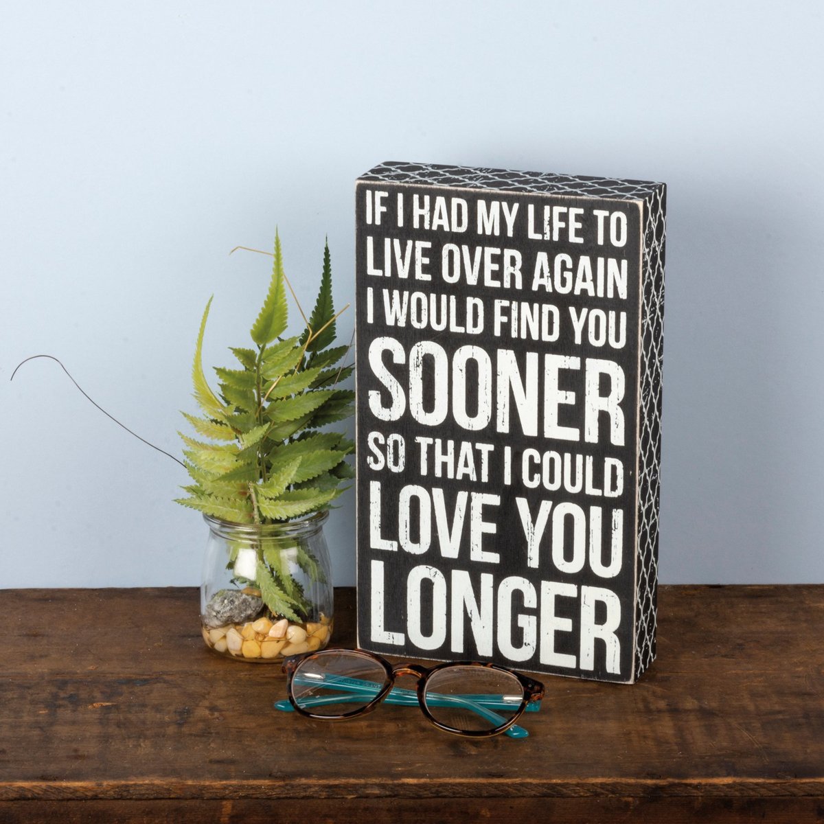 A classic black and white wooden box sign featuring a distressed "If I Had My Life To Live Over Again I Would Find You Sooner So That I Could Love You Longer" sentiment with tile print trim designs. Easy to hang or can free-stand alone.