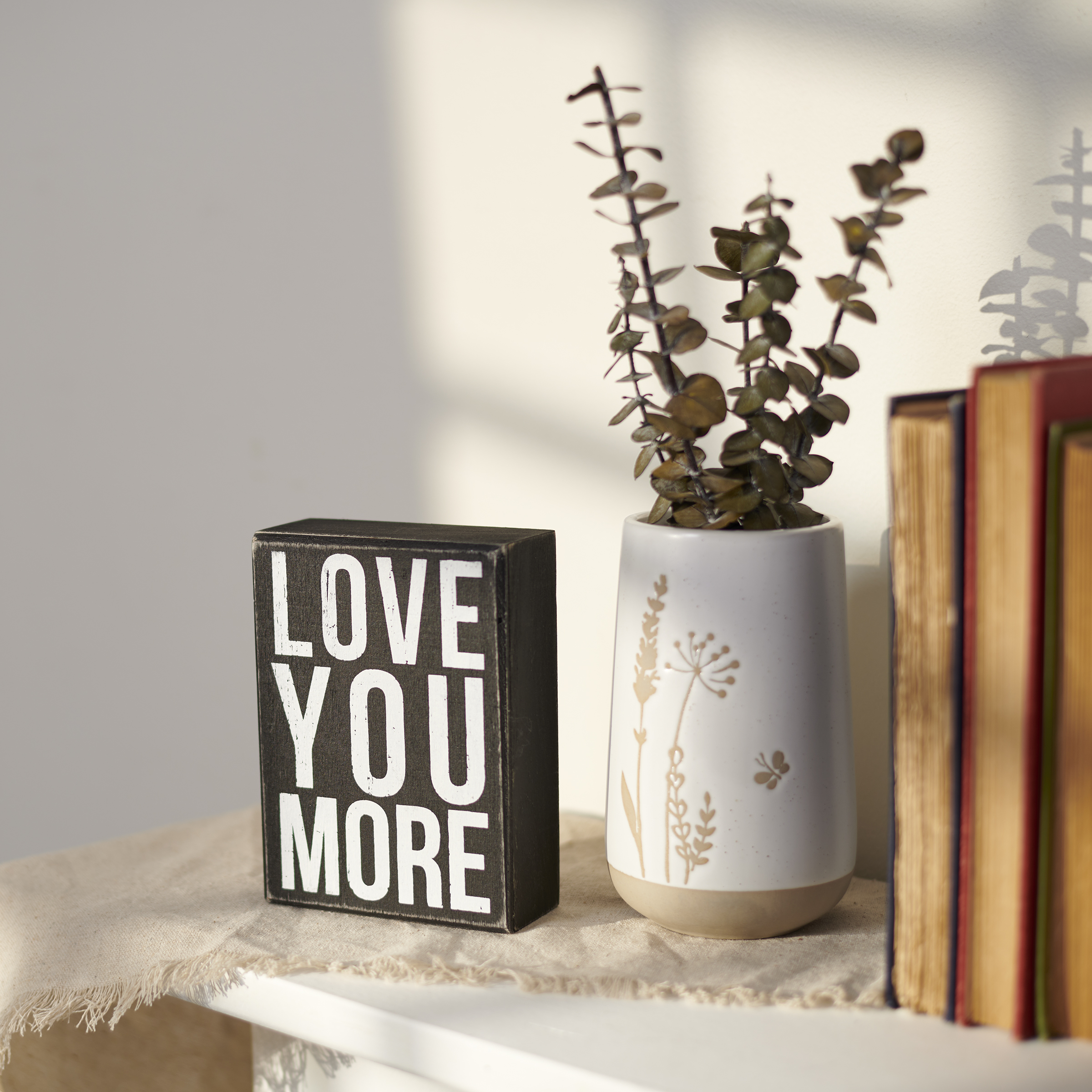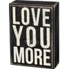 A classic black and white wooden box sign from our Box Sign Collection features a distressed "Love You More" sentiment. The Love You More box sign is easy to hang or can free-stand alone.