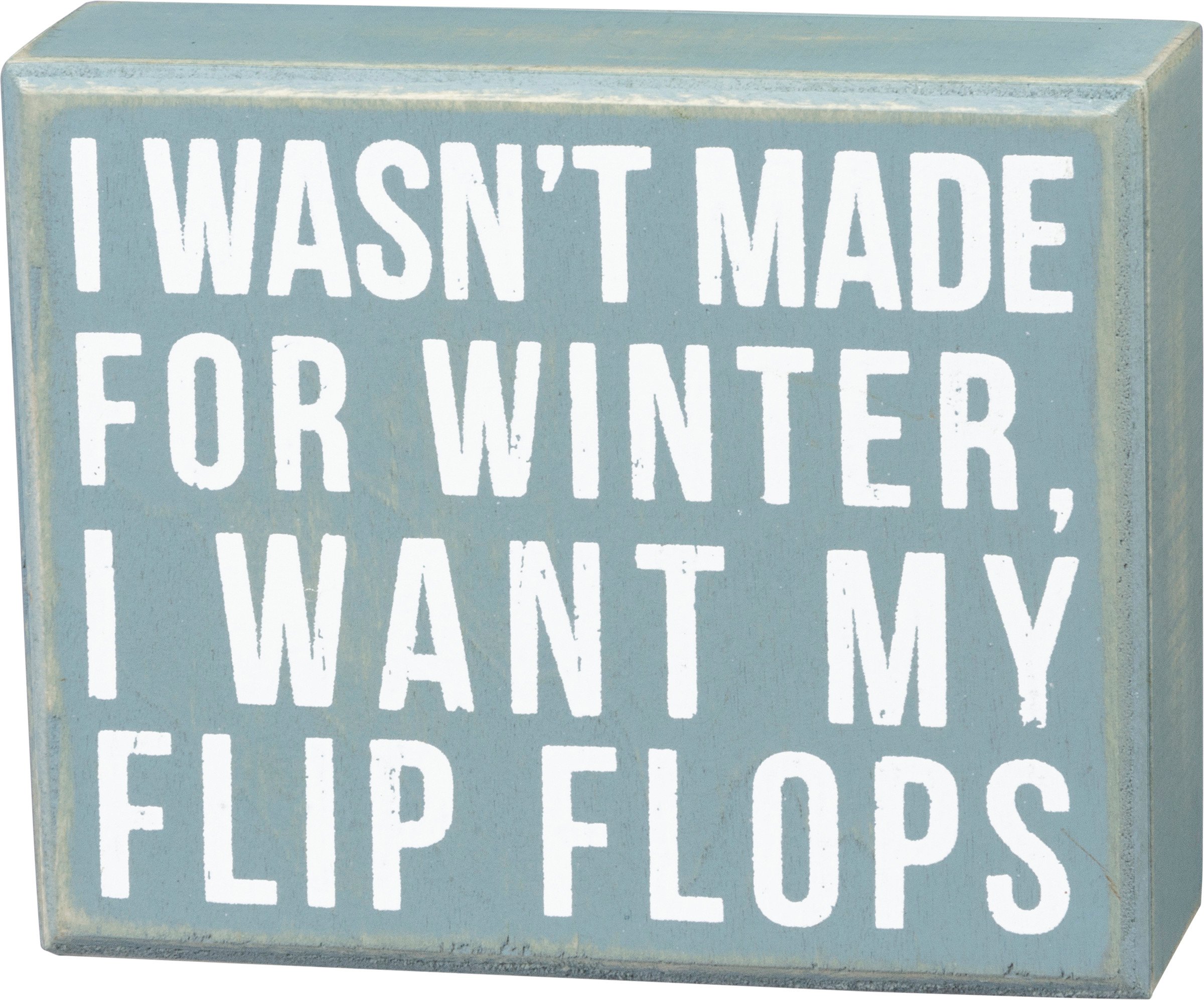 A wooden box sign featuring a distressed "I Wasn't Made For Winter, I Want My Flip Flops" sentiment in a beach-inspired palette. Complements well with existing decor or coordinating design pieces. Easy to hang or can free-stand alone on a shelf or mantel.