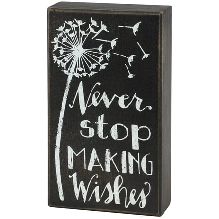 A stylish box sign from our Hand Illustrated Collection displaying a dandelion blowing in the wind with an inspirational sentiment that reads "Never Stop Making Wishes." This inspirational box sign features distressed details with coordinating black color on the sides and back. Our Making Wishes sign is easy to hang or can free-stand on a flat surface for display. An inspirational gift that can be easily displayed in any home or work space. Not eligible for discounting.