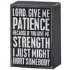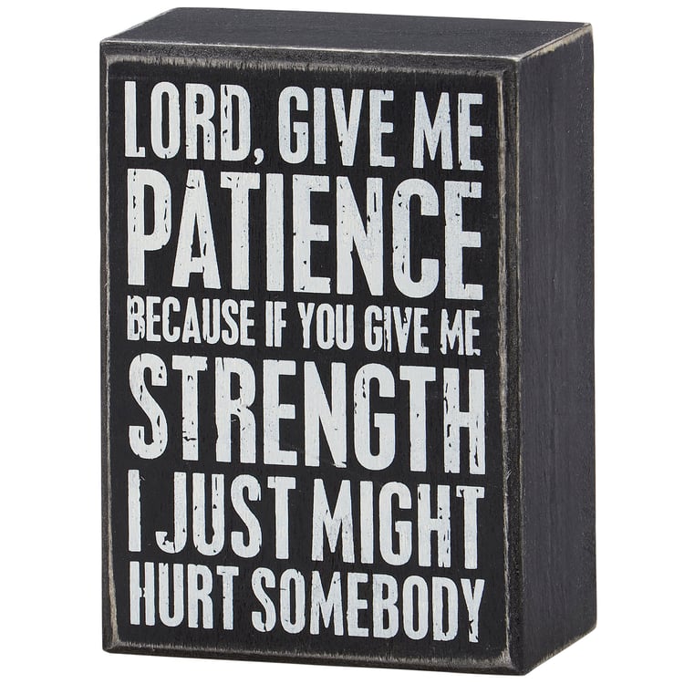 A classic black and white wooden box sign from our Box Sign Collection displaying a sassy faith inspired sentiment that reads "Lord, Give Me Patience Because If You Give Me Strength I Just Might Hurt Somebody." Funny faith box sign features distressed details with coordinating black color on sides and back. Our Might Hurt Somebody box sign is easy to hang or can free-stand alone. A funny faith-themed gift that can be easily displayed in any home or work space.