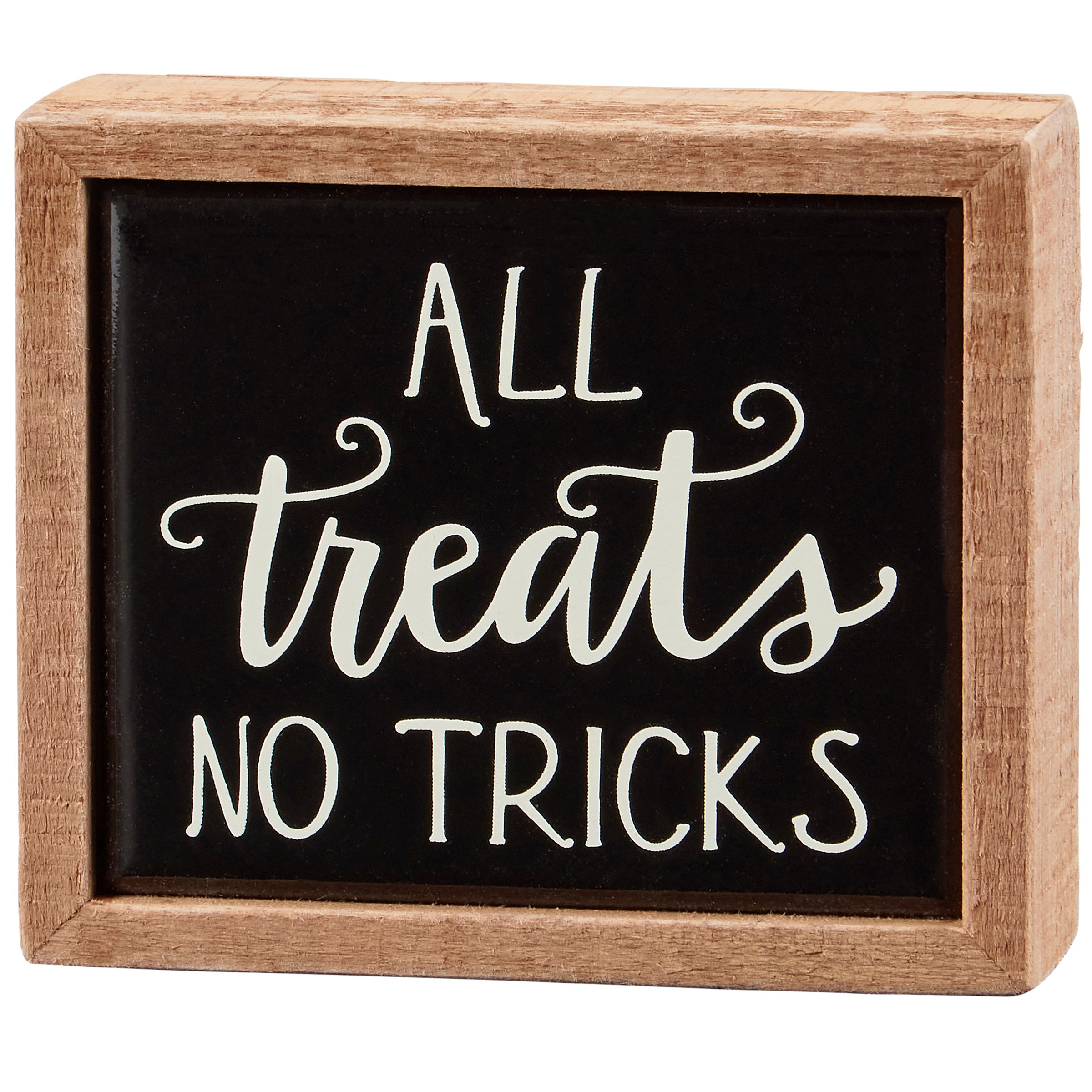 A small wooden box sign from our Halloween Collection displaying a fun seasonal sentiment in a hand illustrated style on black background that reads "All Treats No Tricks." Halloween box sign features a natural wood frame and faux enamel finish behind design for a tile-like appearance. Our All Treats No Tricks box sign mini is easy to hang or can free-stand alone. A fun Halloween-themed home accent that can easily blend into any display.