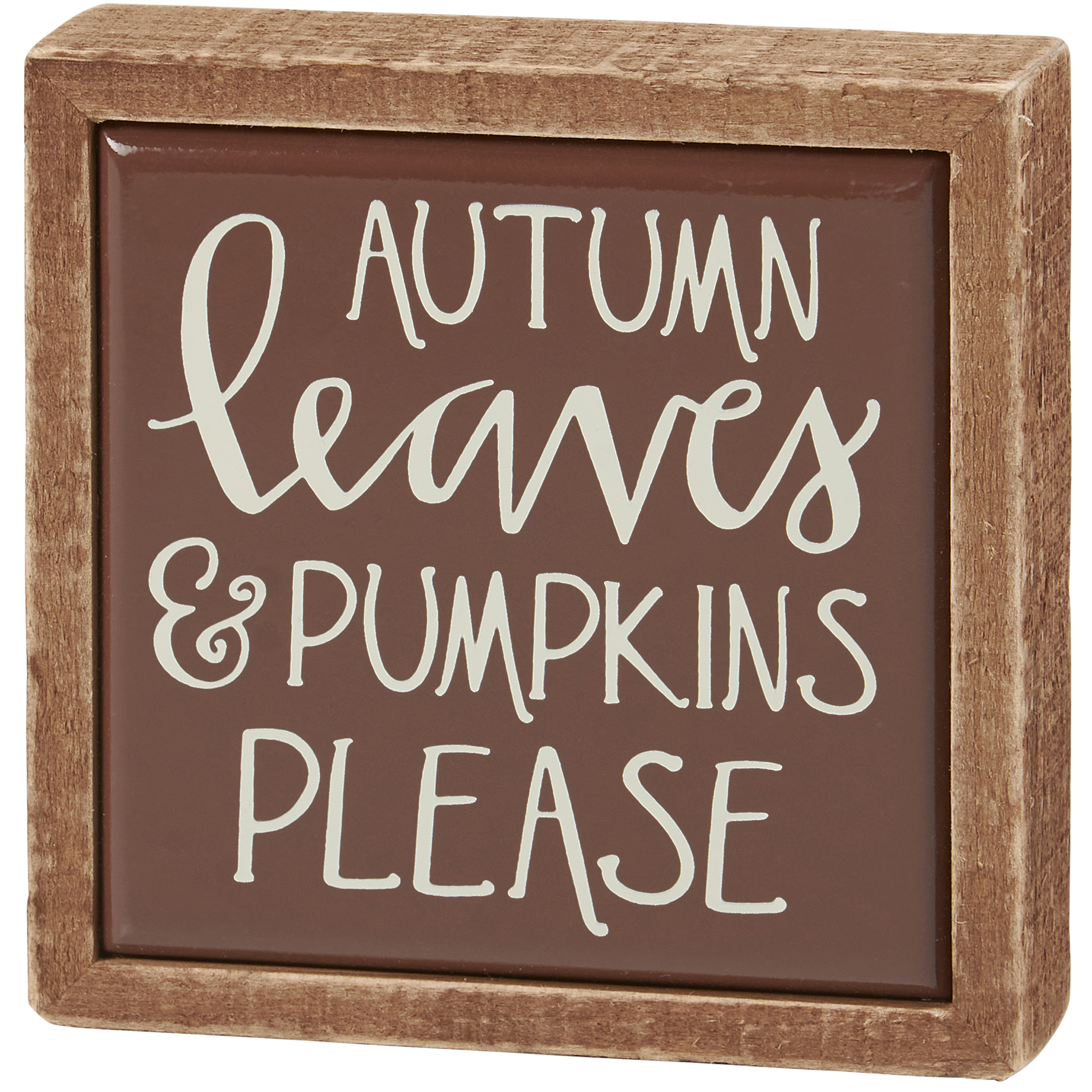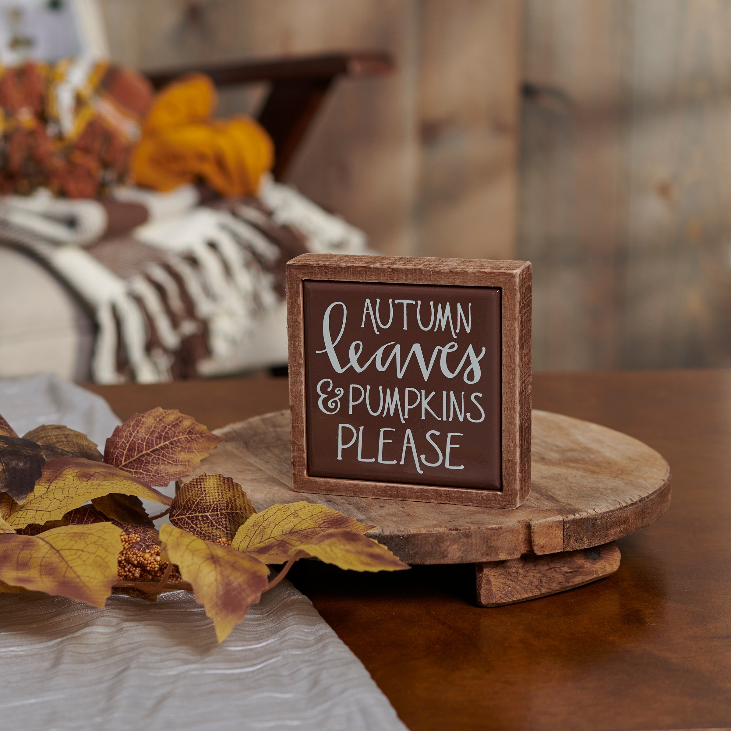 A small wooden box sign from our Fall & Harvest Collection displaying a fun fall inspired sentiment in a unique hand illustrated style that reads "Autumn Leaves & Pumpkin Please." Box sign features a natural wood frame and faux enamel finish behind design for a tile-like appearance. Our Autumn Leaves mini sign is easy to hang or can free-stand alone. A fun gift perfect as a seasonal home accent that can easily blend into any display.
