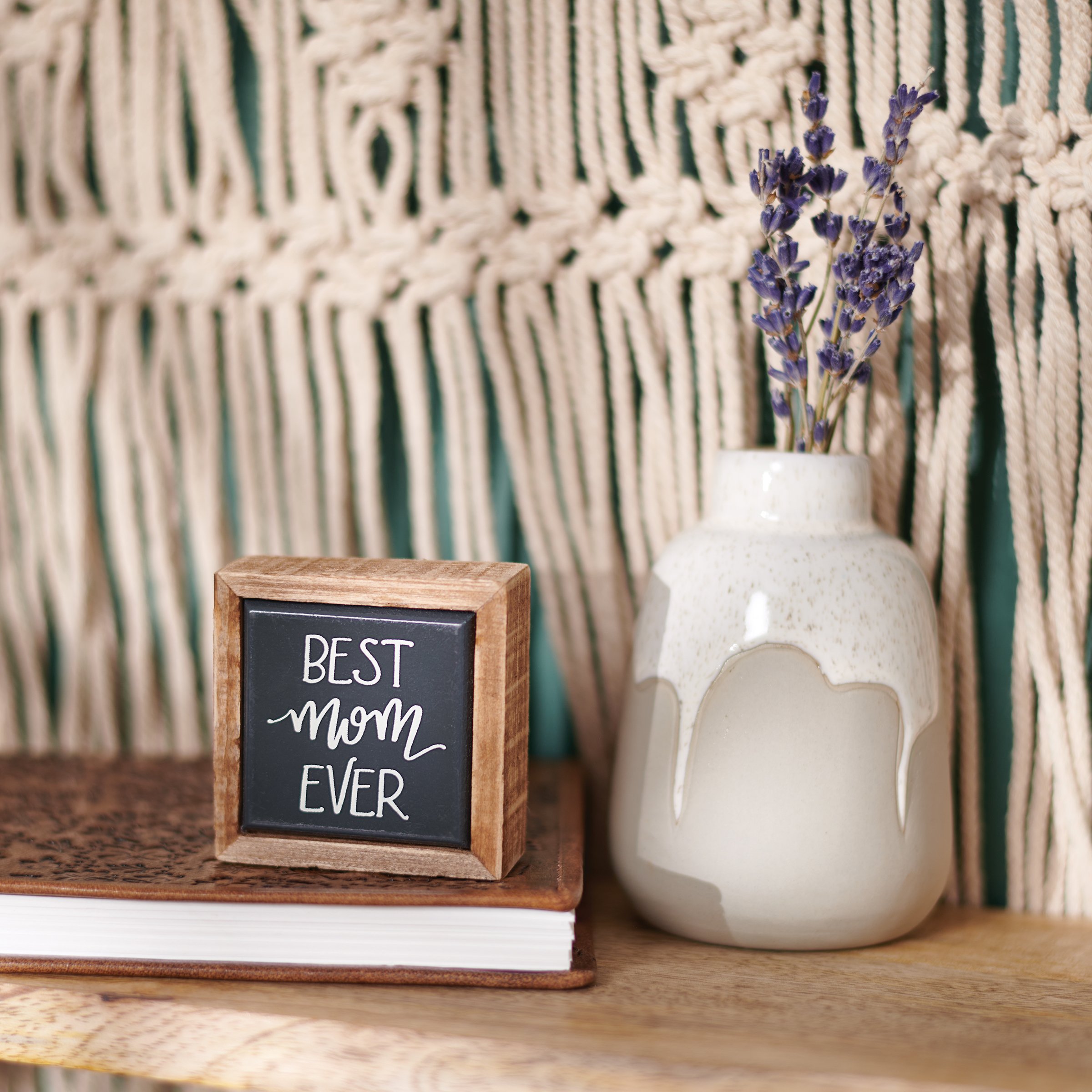 A wooden box sign mini from our Family Collection featuring a hand lettered "Best Mom Ever" sentiment and faux enamel finish for tile-like appearance. The Best Mom Ever sign is easy to hang or can free-stand alone.