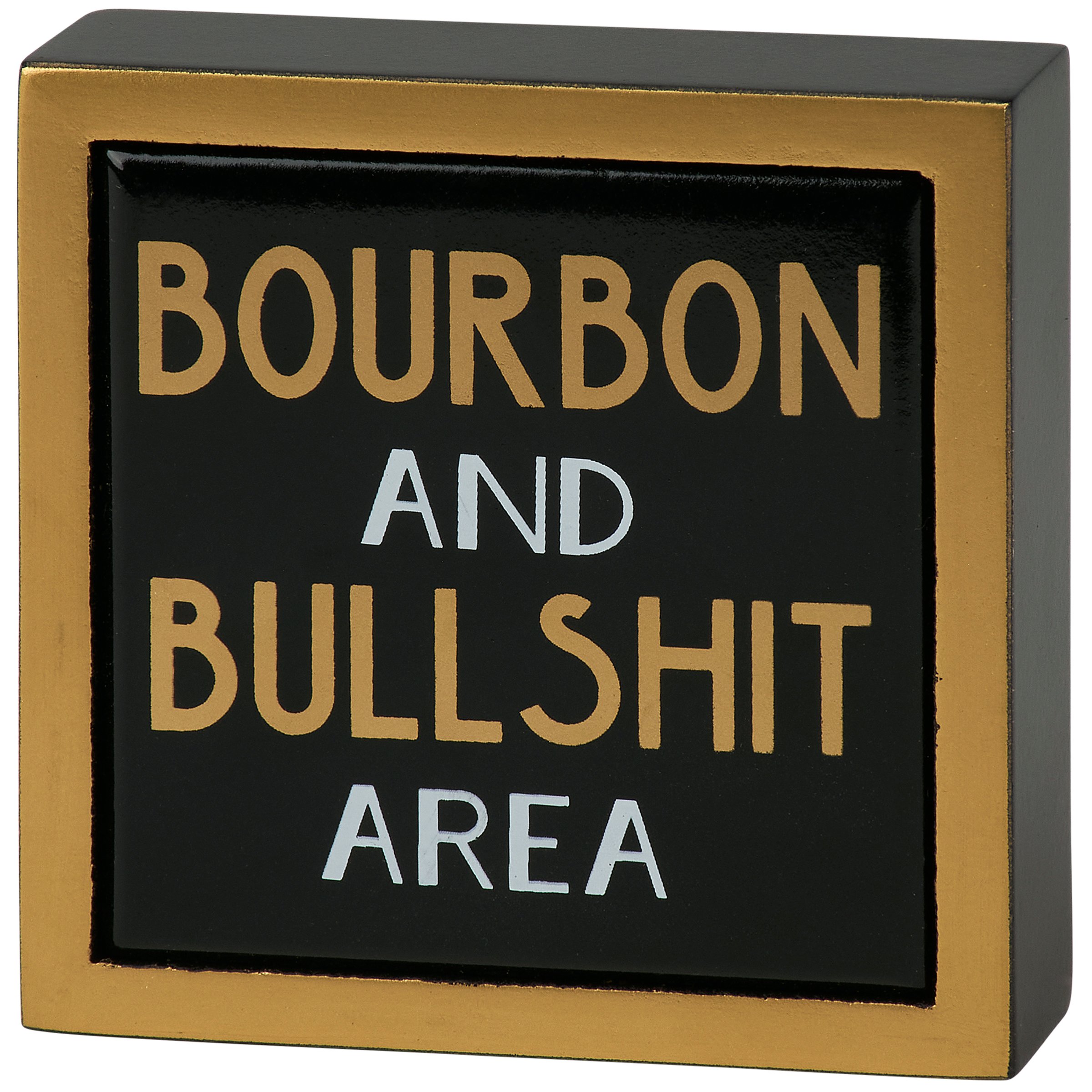 A small wooden box sign from our Art Deco Collection displaying an art deco inspired design with a fun alcohol themed sentiment that reads "Bourbon And Bullshit Area." Mini bar sign features a black and metallic gold color palette with a faux enamel finish behind design for a tile-like appearance. Our Bourbon Area sign is easy to hang or can free-stand on a flat surface for display. A fun alcohol themed home accent that adds style and personality to bar decor.