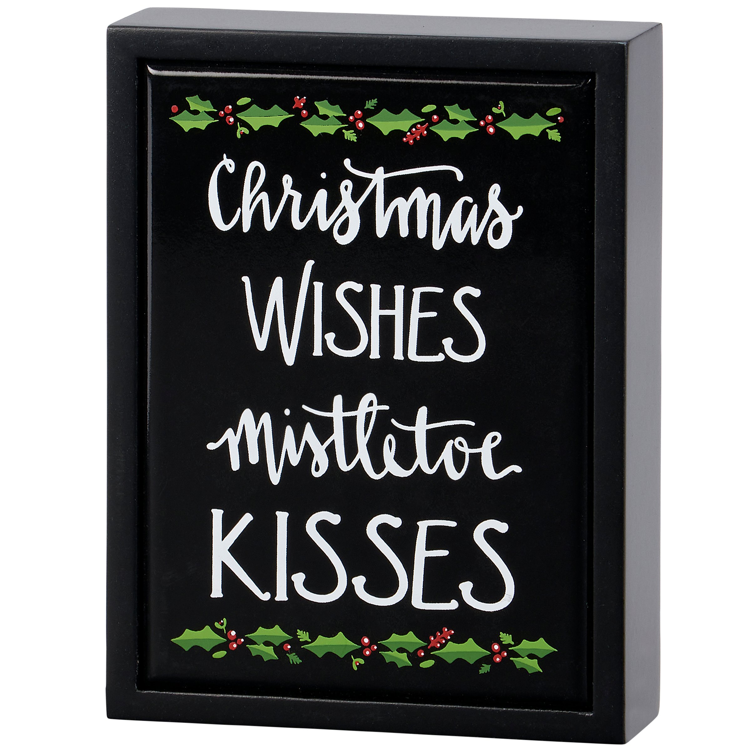 A small wooden box sign from our Christmas Collection displaying holly designs around a fun seasonal sentiment in a hand illustrated style that reads "Christmas Wishes Mistletoe Kisses." Moody Christmas box sign features a coordinating black wood frame and faux enamel black finish behind design for a tile-like appearance. Our Christmas Wishes box sign mini is easy to hang or can free-stand alone. A moody home accent that can easily blend into any seasonal display.