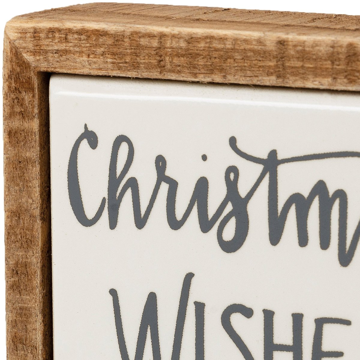A small wooden box sign from our Christmas Collection displaying a fun holiday inspired sentiment in a unique hand illustrated style that reads "Christmas Wishes Mistletoe Kisses." Design features a neutral Christmas style with cool gray on cream background to easily coordinate with home décor. Seasonal box sign features a natural wood frame and faux enamel finish behind design for a tile-like appearance. Our Christmas Wishes Mistletoe Kisses mini box sign is easy to hang on the wall or can free-stand alone on any flat surface. A fun gift perfect as a seasonal home accent that can be easily displayed in any home or workspace.