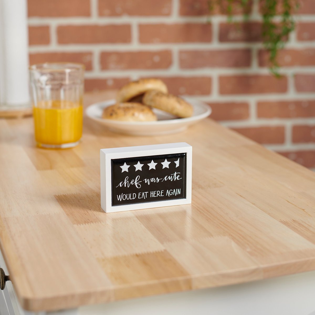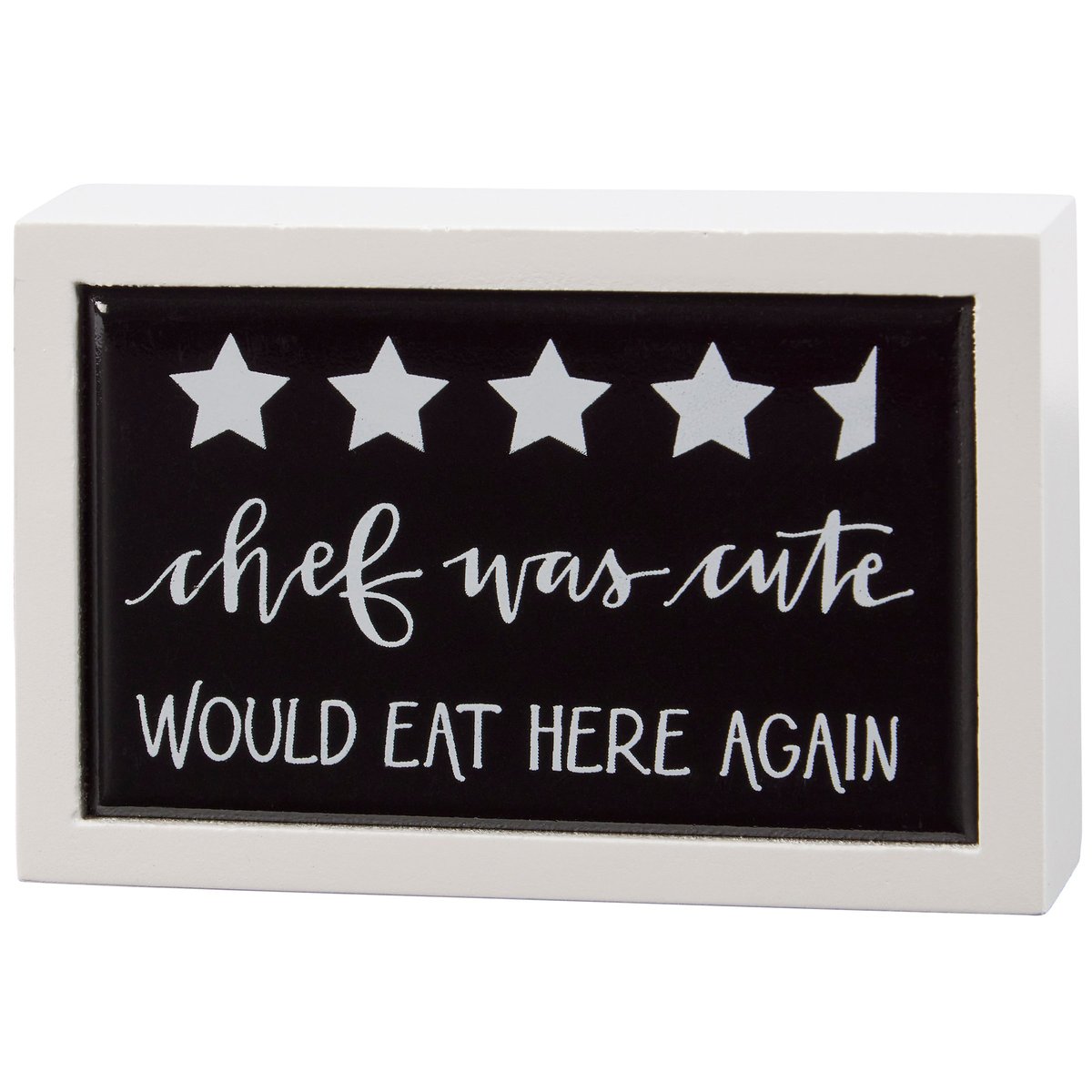 A small wooden box sign from our Room By Room Collection displaying 4 and a half stars with a fun kitchen inspired sentiment that reads "Chef Was Cute - Would Eat Here Again." Kitchen box sign mini features a coordinating clean white color frame. Funny sentiment is made in a unique hand illustrated style on black color with faux enamel finish for a tile-like appearance that effortlessly blends in with any kitchen. Our Eat Here mini box sign is easy to hang or can free-stand alone. A funny gift that can be easily displayed in any kitchen.