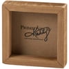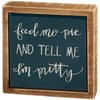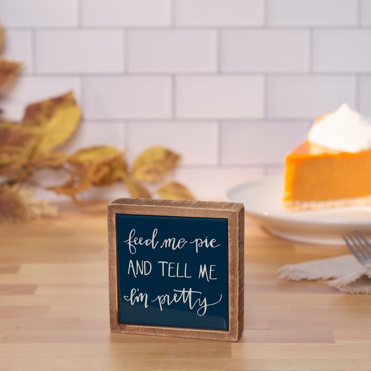 A small wooden box sign from our Fall & Harvest Collection displaying a fun seasonal sentiment in a hand illustrated style on autumn blue background that reads "Feed Me Pie And Tell Me I'm Pretty." Seasonal box sign features a natural wood frame and faux enamel finish behind design for a tile-like appearance. Our Feed Me Pie sign is easy to hang or can free-stand on flat surface for display. A fun fall-themed home accent that can be easily displayed in any home or work space.
