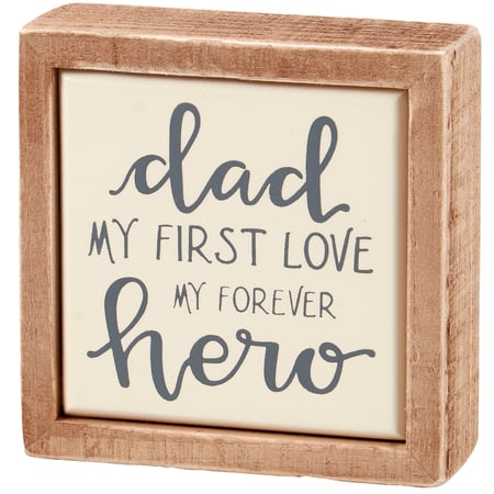 A small wooden box sign from our Father's Day Collection displaying a heartwarming dad-themed sentiment in a unique hand illustrated style that reads "Dad - My First Love - My Forever Hero." Box sign features a natural wood frame and faux enamel finish behind design for a tile-like appearance. Our Forever Hero box sign mini is easy to hang or can free-stand alone. A loving gift perfect for Father's Day or as an everyday home accent that can easily blend into any display.