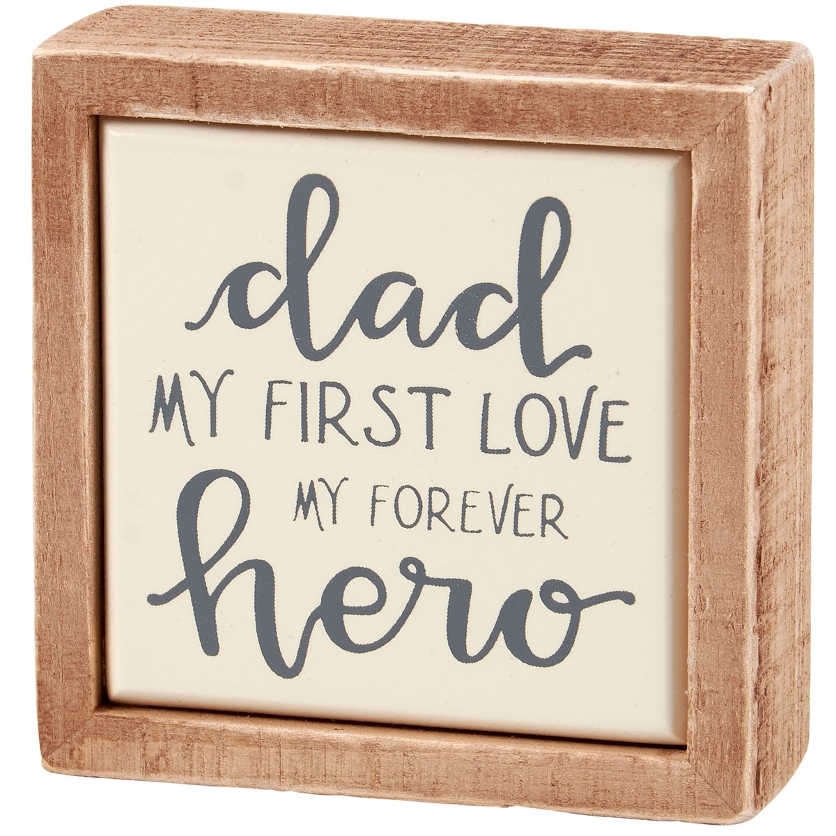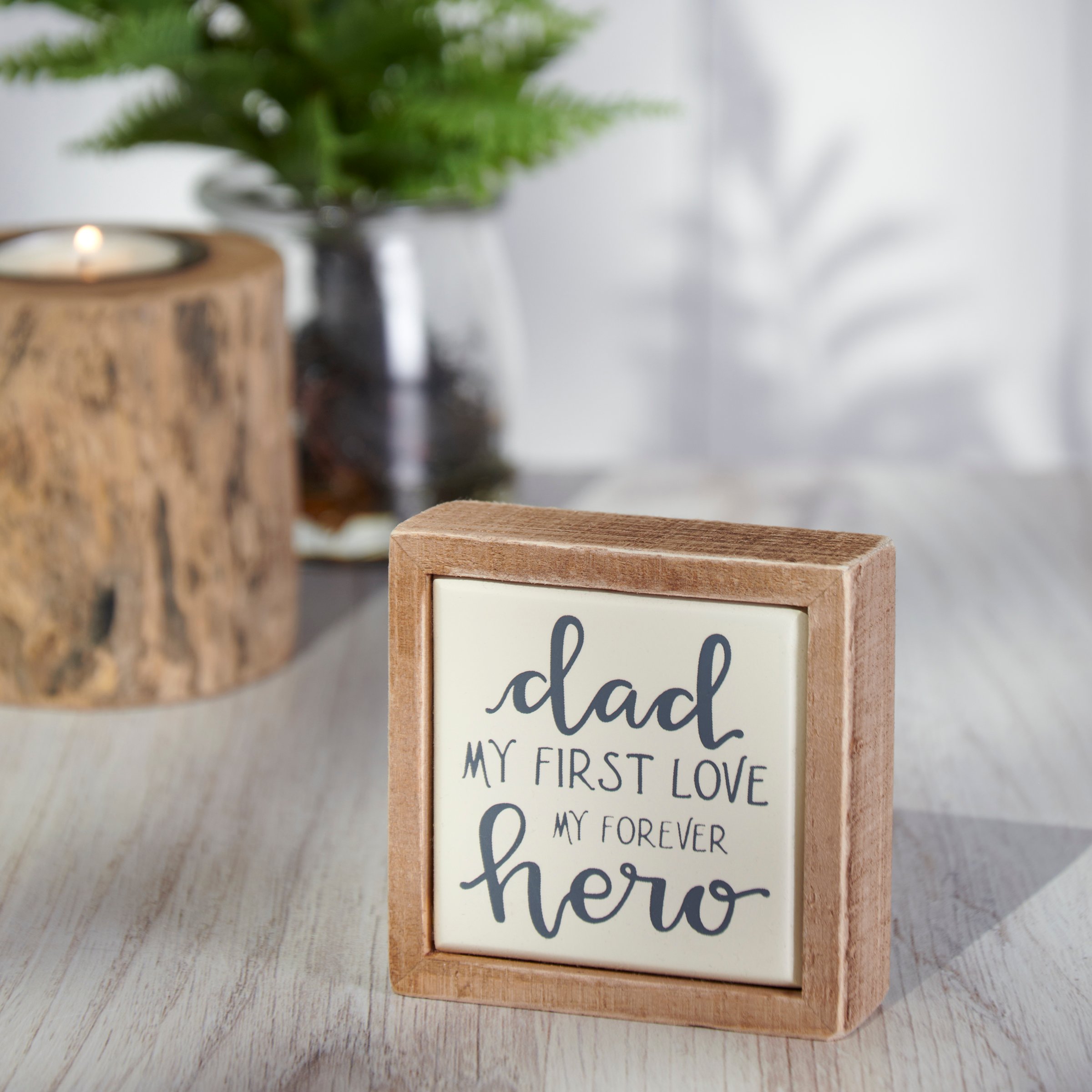A small wooden box sign from our Father's Day Collection displaying a heartwarming dad-themed sentiment in a unique hand illustrated style that reads "Dad - My First Love - My Forever Hero." Box sign features a natural wood frame and faux enamel finish behind design for a tile-like appearance. Our Forever Hero box sign mini is easy to hang or can free-stand alone. A loving gift perfect for Father's Day or as an everyday home accent that can easily blend into any display.
