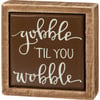 A wooden box sign mini featuring a hand lettered "Gobble 'Til You Wobble" sentiment and tile-like finish. Easy to hang or can free-stand alone.