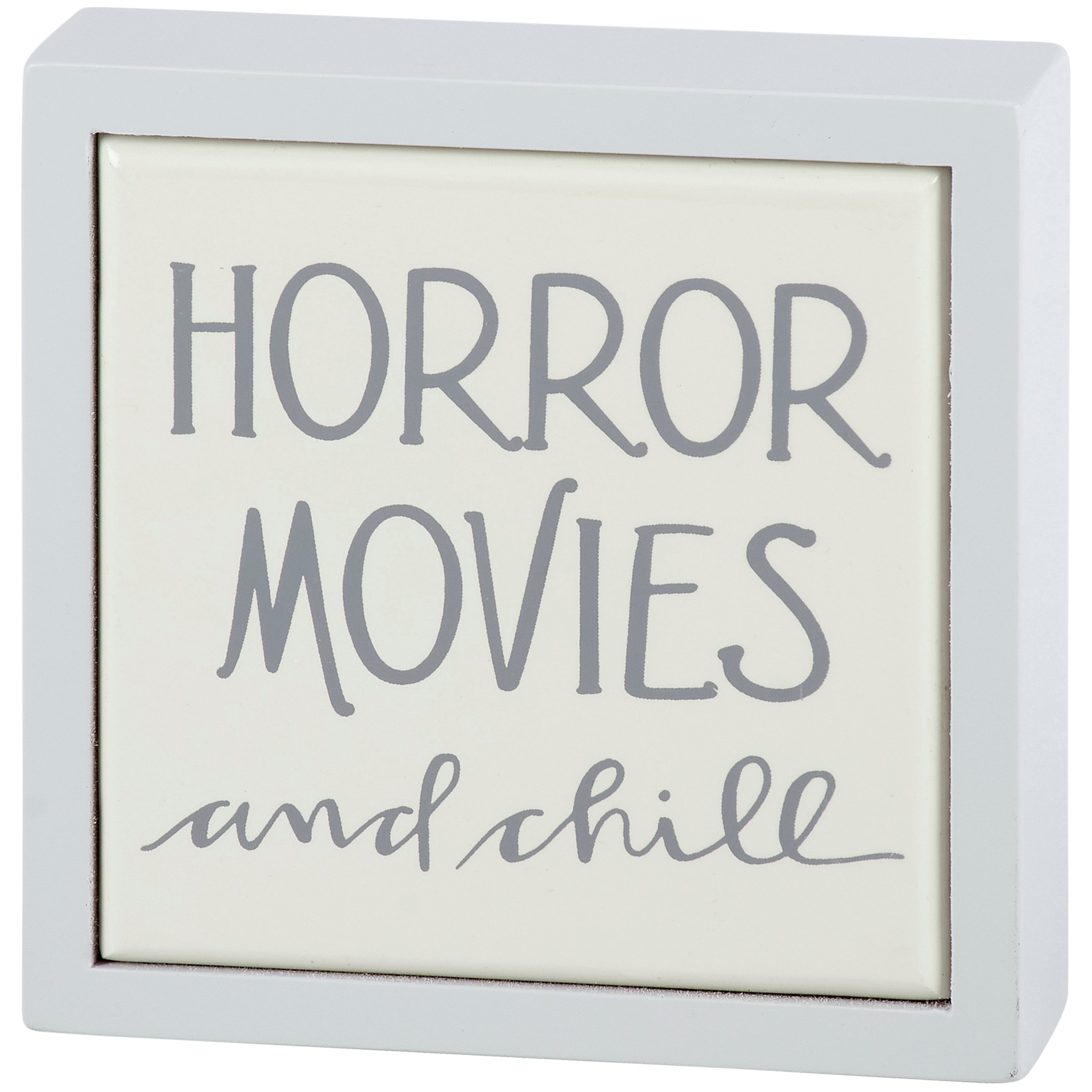 A small wooden box sign from our Haunted White Collection displaying a fun seasonal sentiment in a hand illustrated style on bone white background that reads "Horror Movies And Chill." Fun Halloween sign features a coordinating white color frame and faux enamel finish behind design for a tile-like appearance. Our Horror Movies And Chill sign is easy to hang or can free-stand alone. A fun Halloween home accent that can easily blend into any seasonal display.