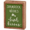 A small wooden box sign from our St. Patrick's Day Collection displaying shamrocks and a unique hand illustrated sentiment on holiday green background that reads "Shamrock Wishes - Irish Kisses." Seasonal mini box sign features a natural wood frame and faux enamel finish behind design for a tile-like appearance. Our Irish Kisses box sign mini is easy to hang or can free-stand alone. A fun St. Patrick's Day themed home accent that can easily blend into any display.