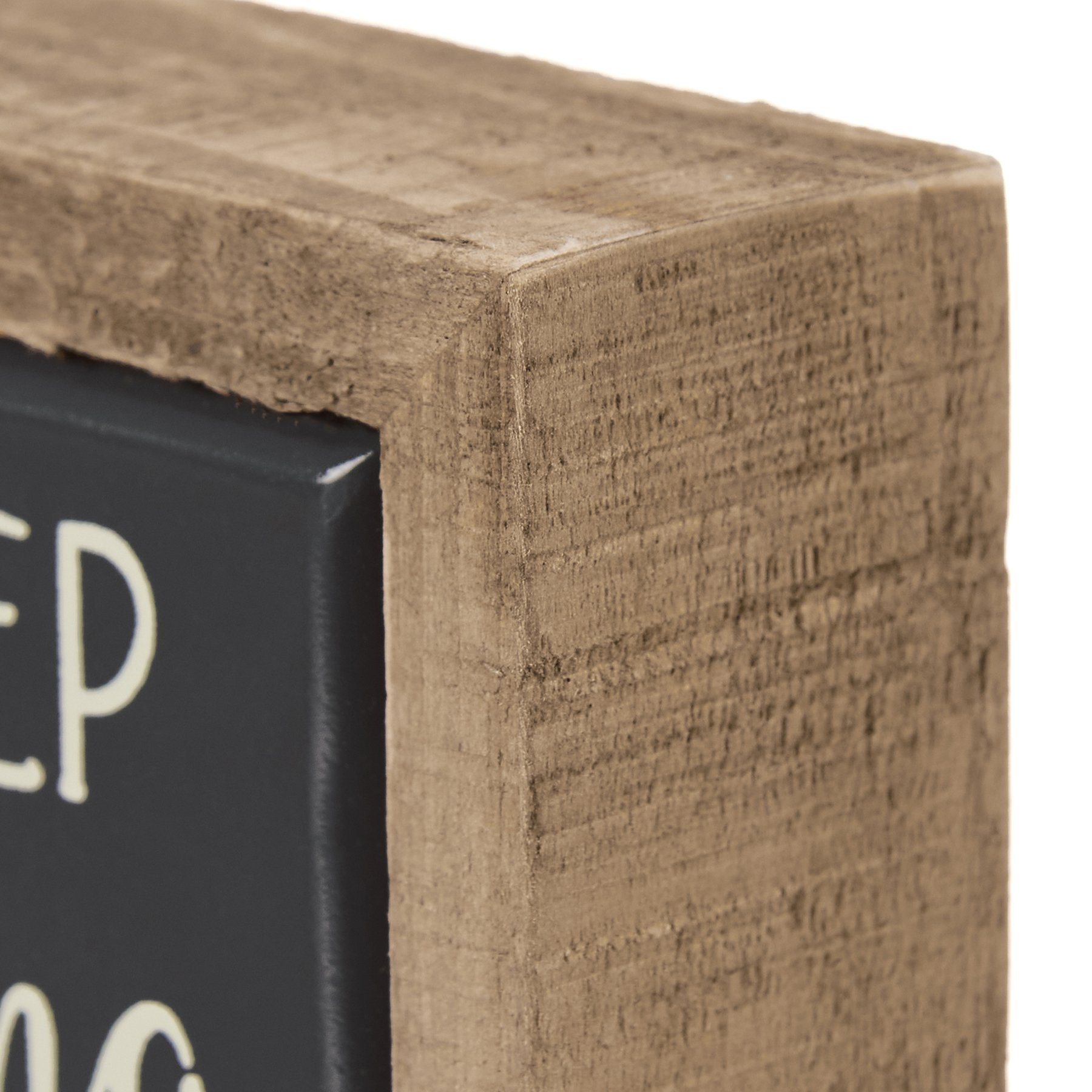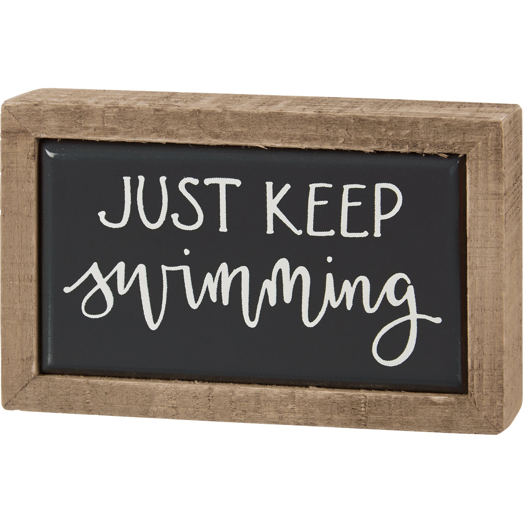 A small wooden box sign from our Hand Illustrated Collection displaying a motivational "Just Keep Swimming" sentiment in a unique hand illustrated style. Box sign features a natural wood frame and faux enamel finish behind design for a tile-like appearance. Our Just Keep Swimming box sign mini is easy to hang or can free-stand alone. An inspirational everyday home accent that can easily blend into any display.