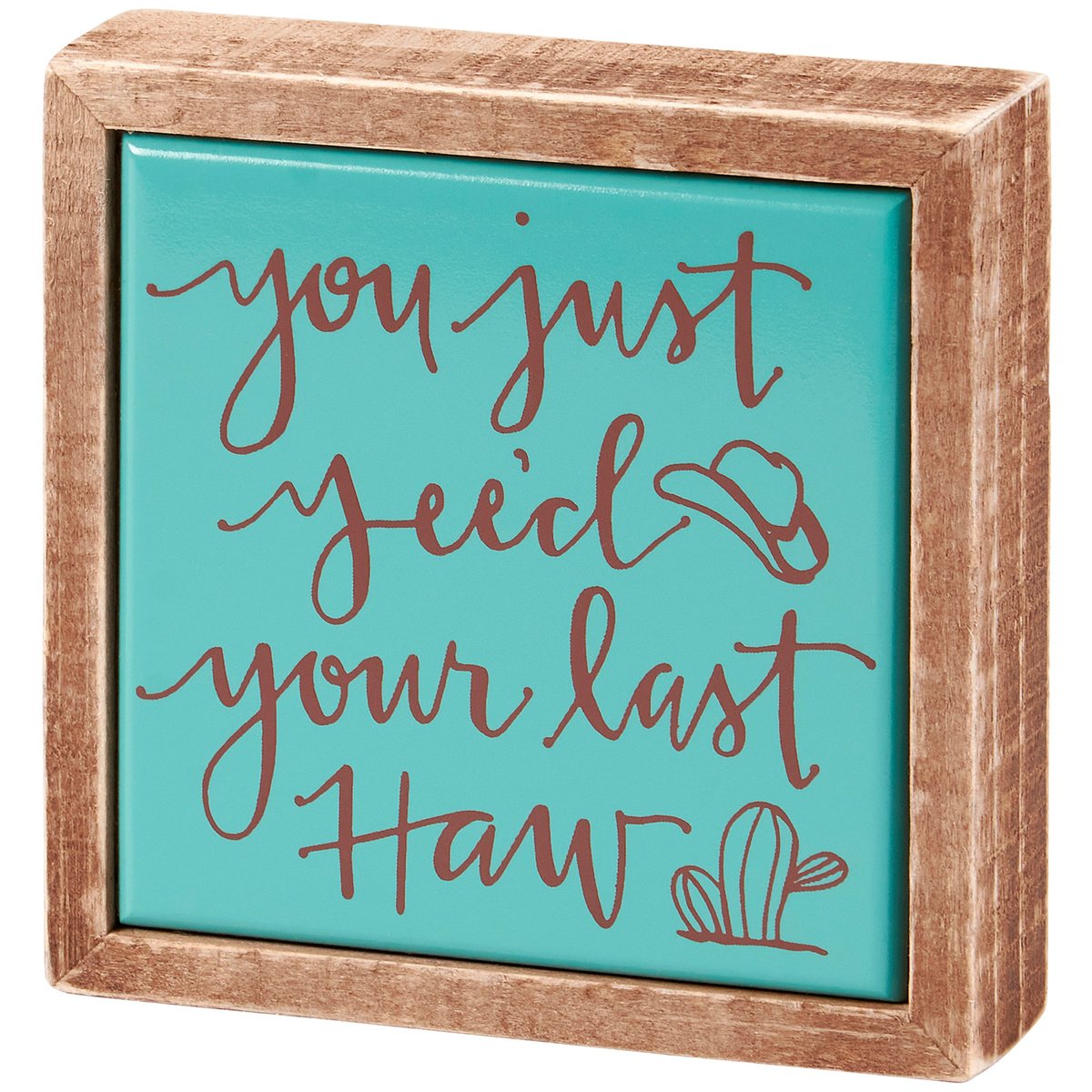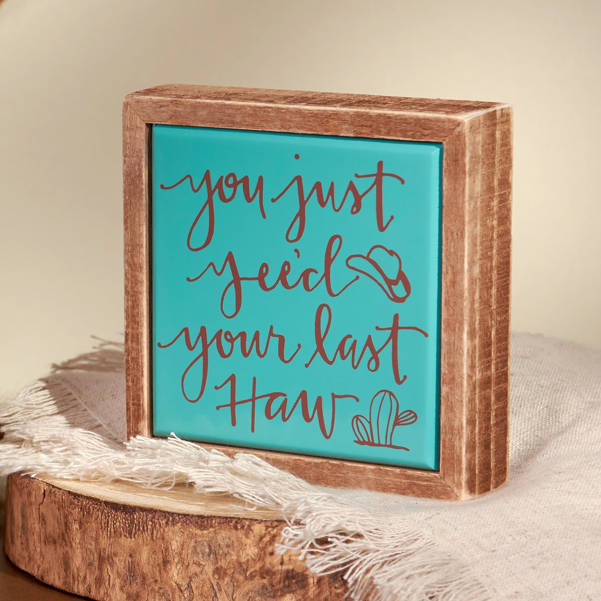 A small wooden box sign from our Western Collection displaying a cowboy hat and a cactus with a fun western inspired sentiment in a hand illustrated style that reads "You Just Yee'd Your Last Haw." Western box sign mini features a western color palette with a natural wood frame and faux enamel finish behind design for a tile-like appearance. Our Just Yee'd Your Last Haw box sign mini is easy to hang or can free-stand alone. A fun western home accent that can easily blend into any display.