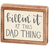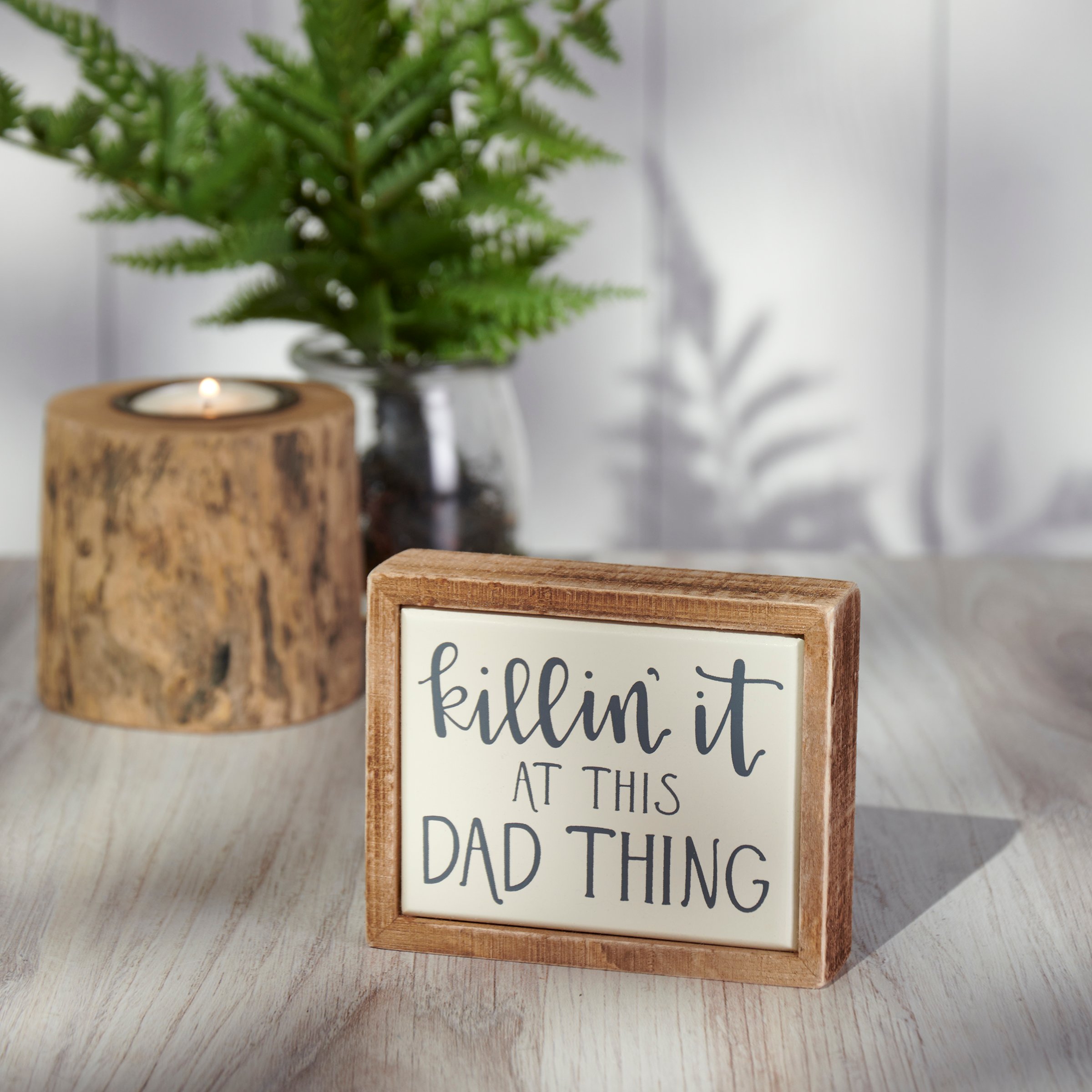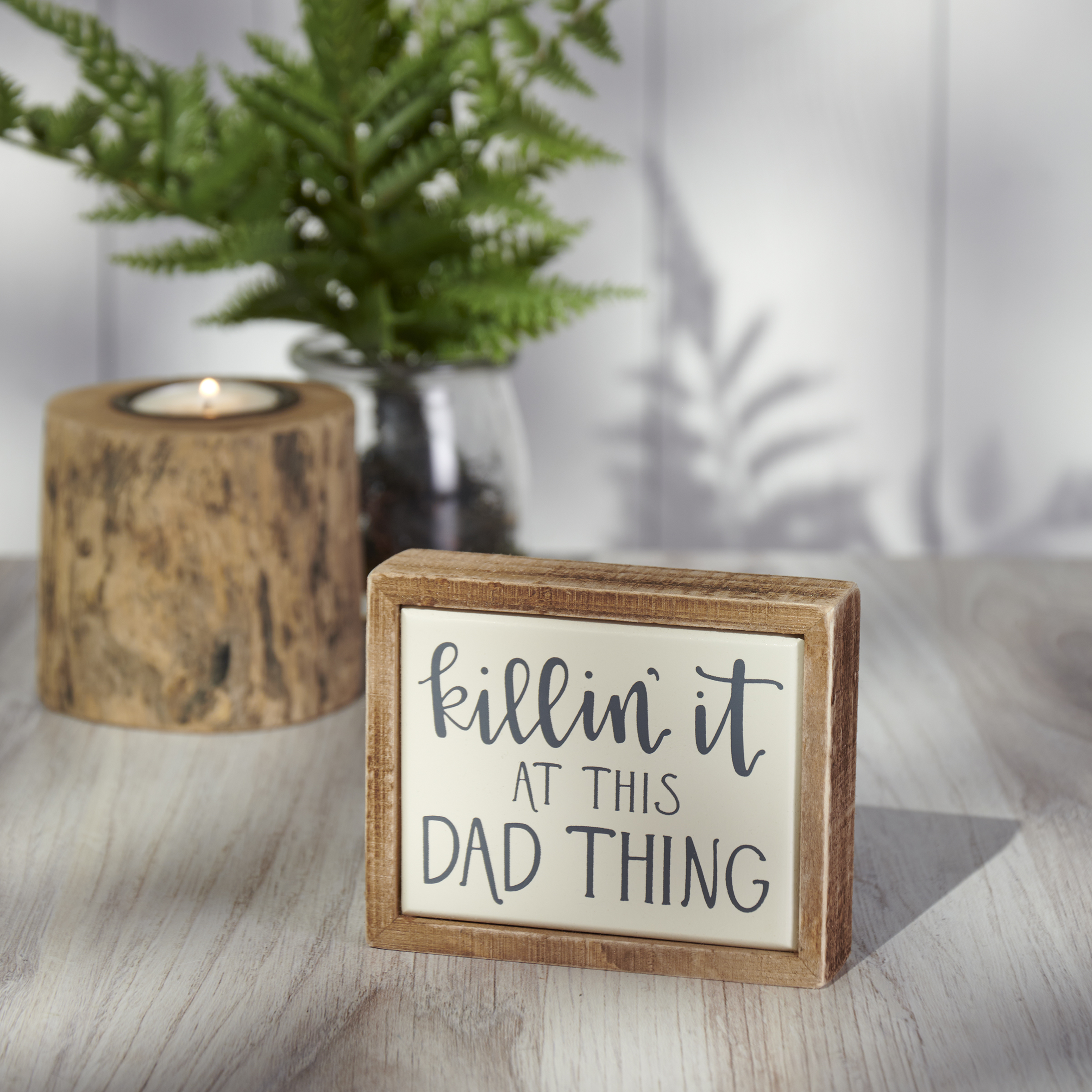A small wooden box sign from our Father's Day Collection displaying a fun dad-themed sentiment in a unique hand illustrated style that reads "Killin' It At This Dad Thing." Box sign features a natural wood frame and faux enamel finish behind design for a tile-like appearance. Our Killin' It box sign mini is easy to hang or can free-stand alone. A fun gift perfect for Father's Day or as an everyday home accent that can easily blend into any display.