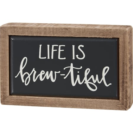 A small wooden box sign from our Hand Illustrated Collection displaying a humorous "Life Is Brew-tiful" sentiment in a unique hand illustrated style. Box sign features a natural wood frame and faux enamel finish behind design for a tile-like appearance. Our Life Is Brew-tiful box sign mini is easy to hang or can free-stand alone. A fun everyday home accent that can easily blend into any display.