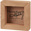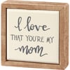 A wooden mini box sign from our Mother's Day Collection displaying a hand illustrated "I Love That You're My Mom" sentiment with faux enamel finish for a tile-like appearance. Our Love That You're My Mom box sign mini is easy to hang or can free-stand alone.