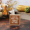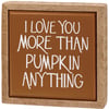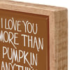 A wooden box sign mini from our Fall & Harvest Collection featuring a hand lettered "I Love You More Than Pumpkin Anything" sentiment, orange tile-like finish, and natural wood sides for added interest. Our Love You More Than Pumpkin Anything mini box sign is easy to hang or can free-stand alone.