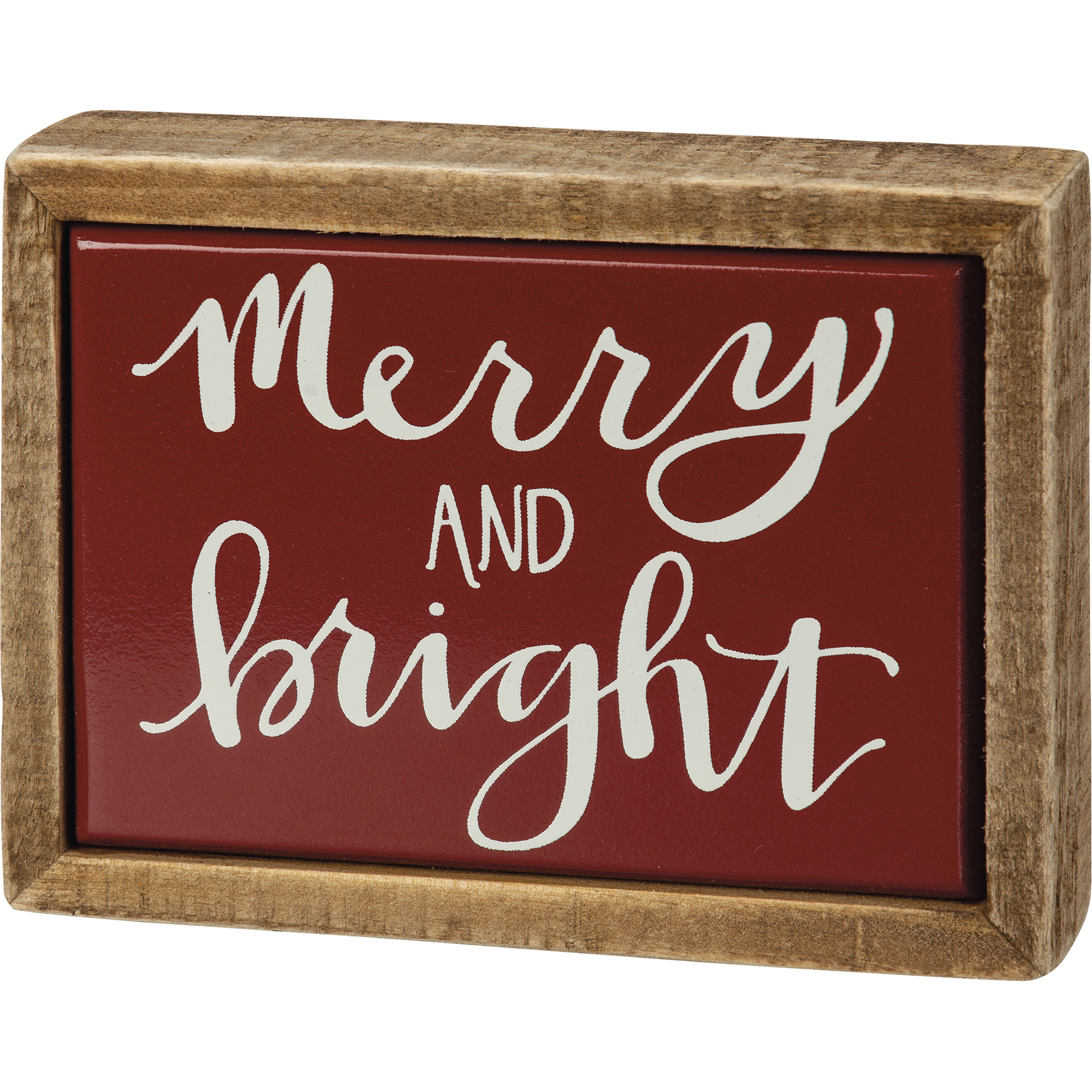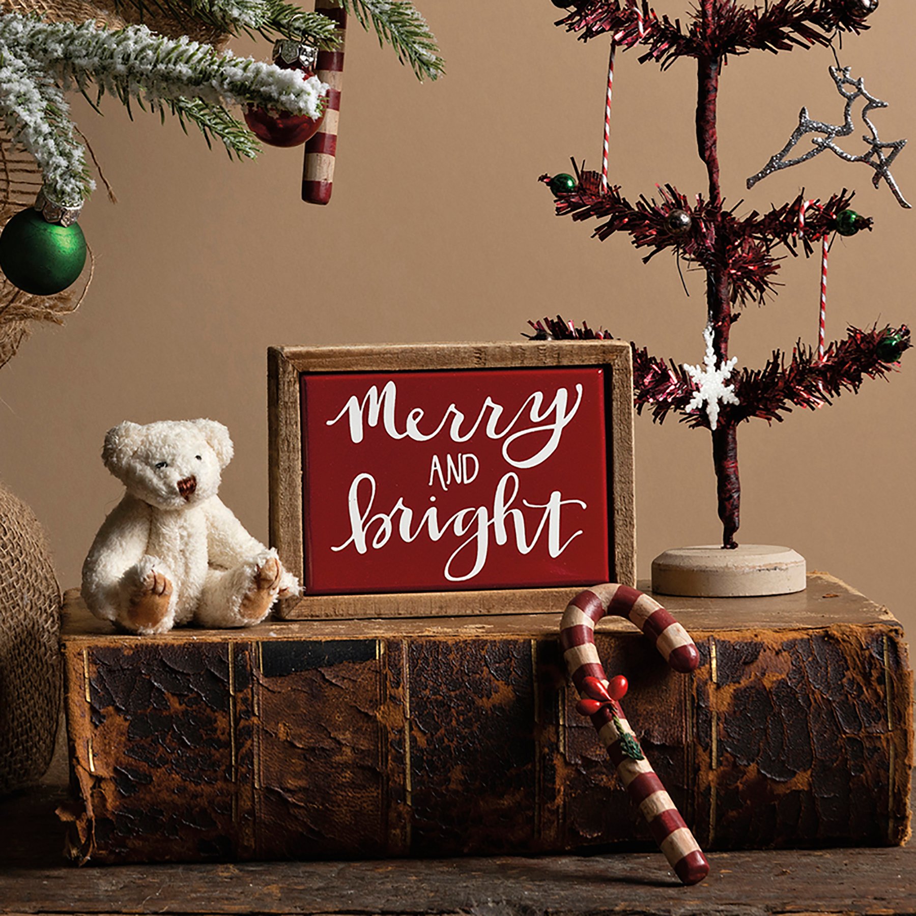 A wooden box sign mini from our festive Christmas Collection featuring a hand lettered "Merry And Bright" sentiment and tile-like finish. Our Merry And Bright sign is easy to hang or can free-stand alone.