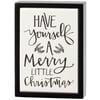 A small wooden box sign from our Christmas Collection displaying holly designs and an inspirational seasonal sentiment in a hand illustrated style that reads "Have Yourself A Merry Little Christmas." Black & white Christmas box sign features a coordinating black wood frame and faux enamel white finish behind design for a tile-like appearance. Our Merry Little Christmas box sign mini is easy to hang or can free-stand alone. A seasonal home accent that can easily blend into any display.
