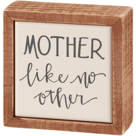 A small wooden box sign from our Mother's Day Collection displaying a heartwarming mom-themed sentiment in a hand illustrated style that reads "Mother Like No Other." Mom box sign mini features a natural wood frame and faux enamel finish behind design for a tile-like appearance. Our Mother Like No Other mini box sign is easy to hang or can free-stand alone. A lovely Mother's Day gift that can easily blend into any display.