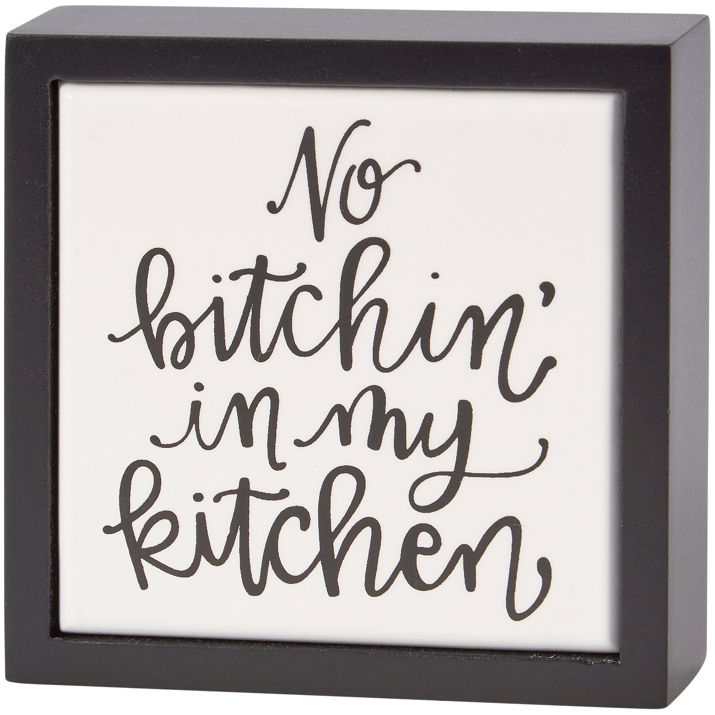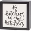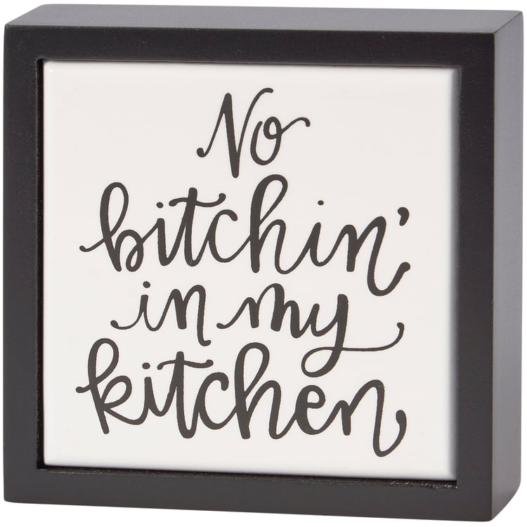 A small wooden box sign from our Room By Room Collection displaying a sassy kitchen inspired sentiment that reads "No Bitchin' In My Kitchen." Kitchen box sign mini features a coordinating black color frame. Funny sentiment is made in a unique hand illustrated style on clean white color with faux enamel finish for a tile-like appearance that effortlessly blends in with any kitchen. Our My Kitchen mini box sign is easy to hang or can free-stand alone. A funny gift that can be easily displayed in any kitchen.