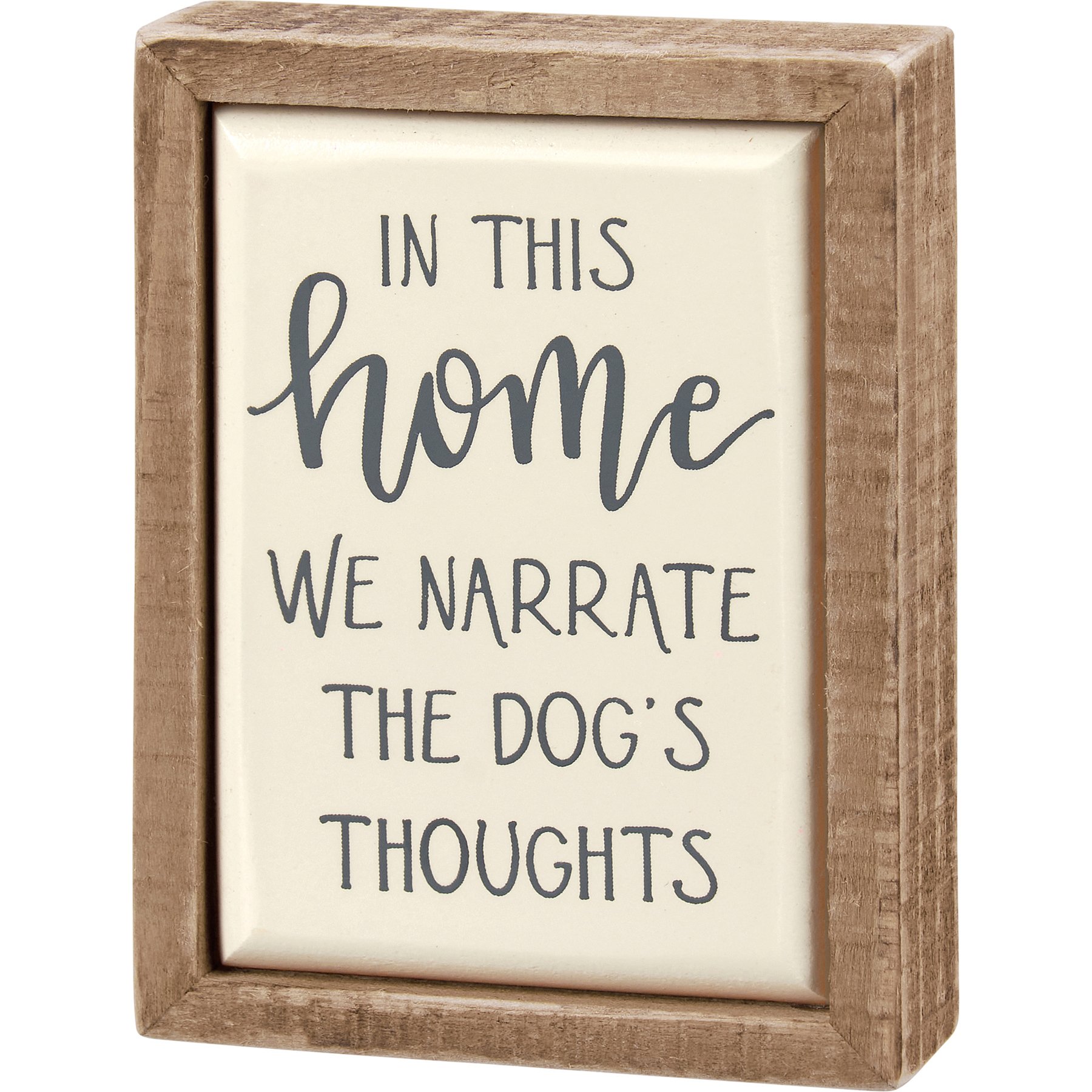 A wooden box sign mini from our Pet Collection featuring a hand lettered "In This Home We Narrate The Dog's Thoughts" sentiment and faux enamel finish for tile-like appearance. Our Narrate The Dog's Thoughts box sign mini is easy to hang or can free-stand alone.