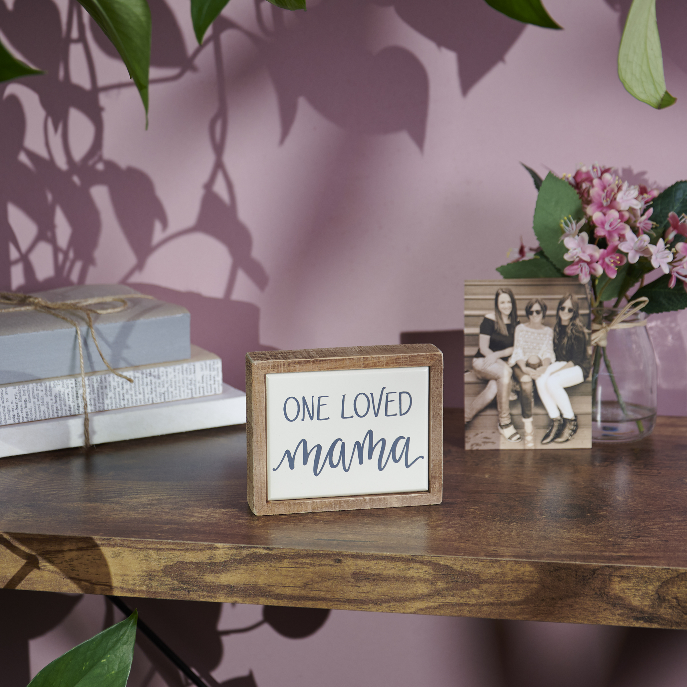 A small wooden box sign from our Mother's Day Collection displaying a fun mom-themed sentiment in a unique hand illustrated style that reads "One Loved Mama." Box sign features a natural wood frame and faux enamel finish behind design for a tile-like appearance. Our One Loved Mama box sign mini is easy to hang or can free-stand alone. A fun gift perfect for Mother's Day or as an everyday home accent that can easily blend into any display.