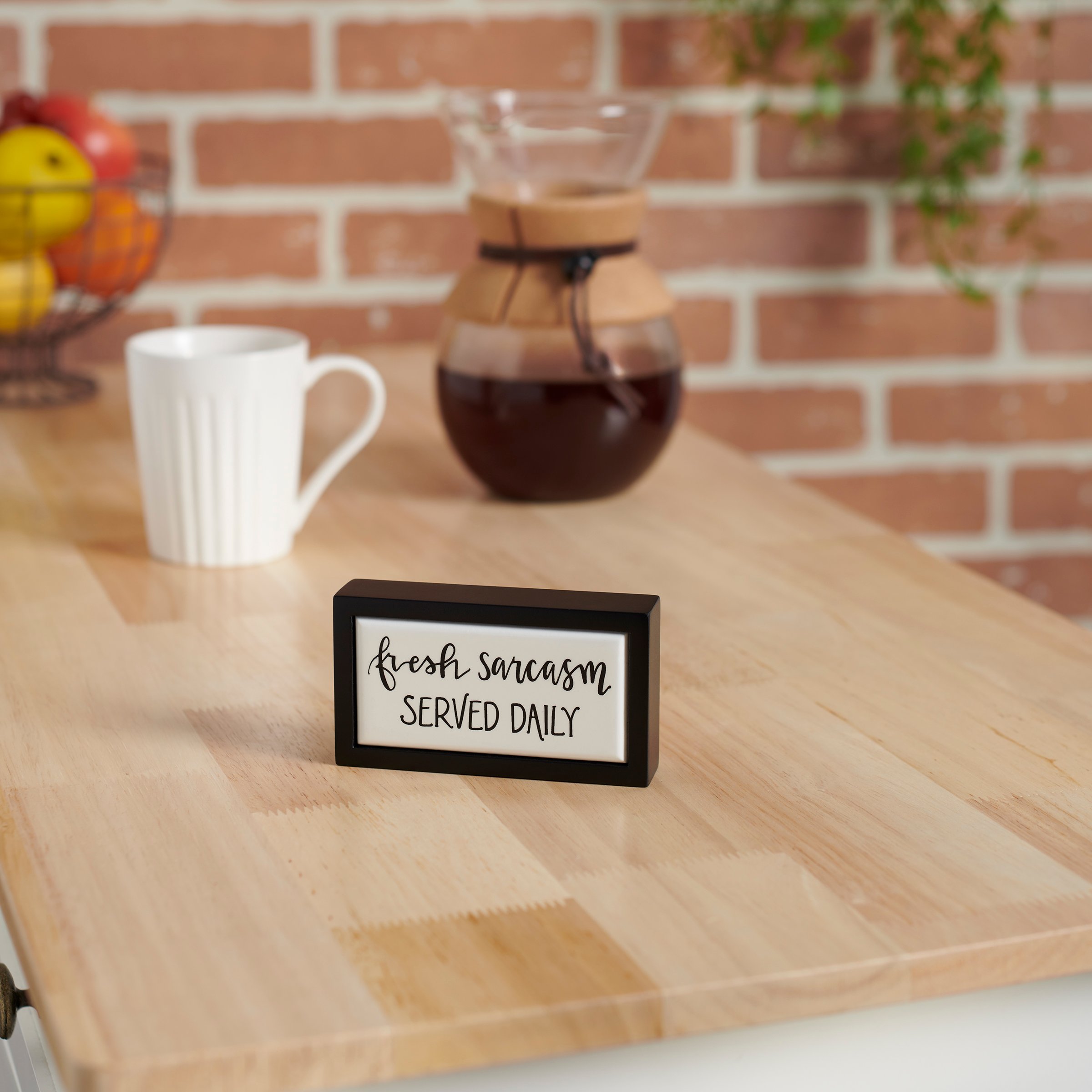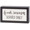 A small wooden box sign from our Hand Illustrated Collection displaying a sassy kitchen inspired sentiment that reads "Fresh Sarcasm Served Daily." Kitchen box sign mini features a coordinating black color frame. Funny sentiment is made in a unique hand illustrated style on clean white color with faux enamel finish for a tile-like appearance that effortlessly blends in with any kitchen. Our Served Daily mini box sign is easy to hang or can free-stand alone. A funny gift that can be easily displayed in any kitchen.