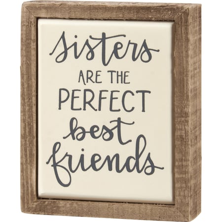 A small wooden box sign from our Hand Illustrated Collection displaying a "Sisters Are The Perfect Best Friends" sentiment in a unique hand illustrated style. Box sign features a natural wood frame and faux enamel finish behind design for a tile-like appearance. Our Sisters Best Friend box sign mini is easy to hang or can free-stand alone. A lovely everyday home accent that can easily blend into any display.