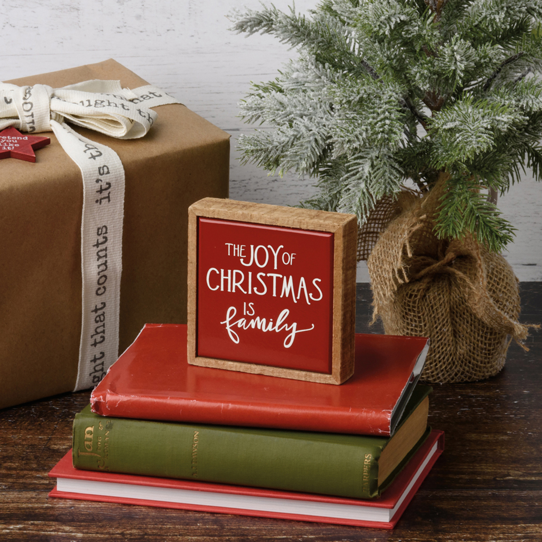 A wooden box sign mini featuring a hand lettered "The Joy Of Christmas Is Family" sentiment and red tile-like faux enamel finish. Our The Joy Of Christmas Is Family box sign mini is easy to hang or can free-stand alone.