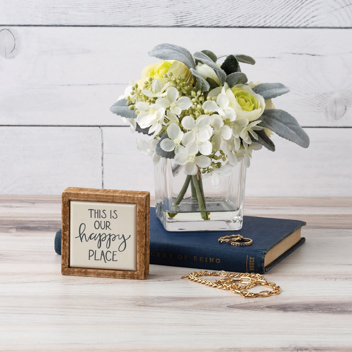 A wooden box sign mini from our Hand Illustrated Collection featuring a hand lettered "This Is Our Happy Place" sentiment and tile-like faux enamel finish for added appeal. Our mini This Is Our Happy Place sign is easy to hang or can free-stand alone.
