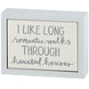A small wooden box sign from our Haunted White Collection displaying a fun seasonal sentiment in a hand illustrated style on bone white background that reads "I Like Long Romantic Walks Through Haunted Houses." Fun Halloween sign features a coordinating white color frame and faux enamel finish behind design for a tile-like appearance. Our Walks Through Haunted Houses sign is easy to hang or can free-stand alone. A fun Halloween home accent that can easily blend into any seasonal display.