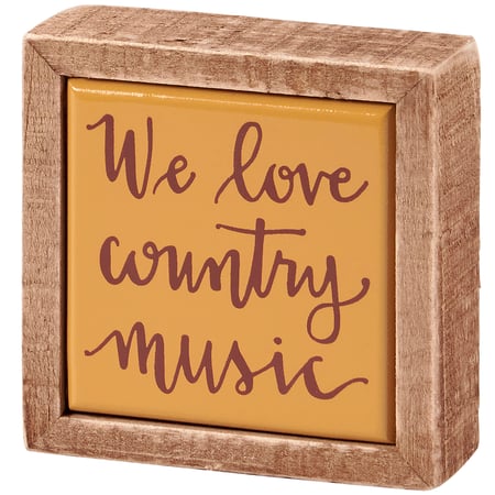 A small wooden box sign from our Western Collection displaying a fun western inspired sentiment in a hand illustrated style that reads "We Love Country Music." Western box sign mini features a western color palette with a natural wood frame and faux enamel finish behind design for a tile-like appearance. Our We Love Country Music mini box sign is easy to hang or can free-stand alone. A fun western home accent that can easily blend into any display.
